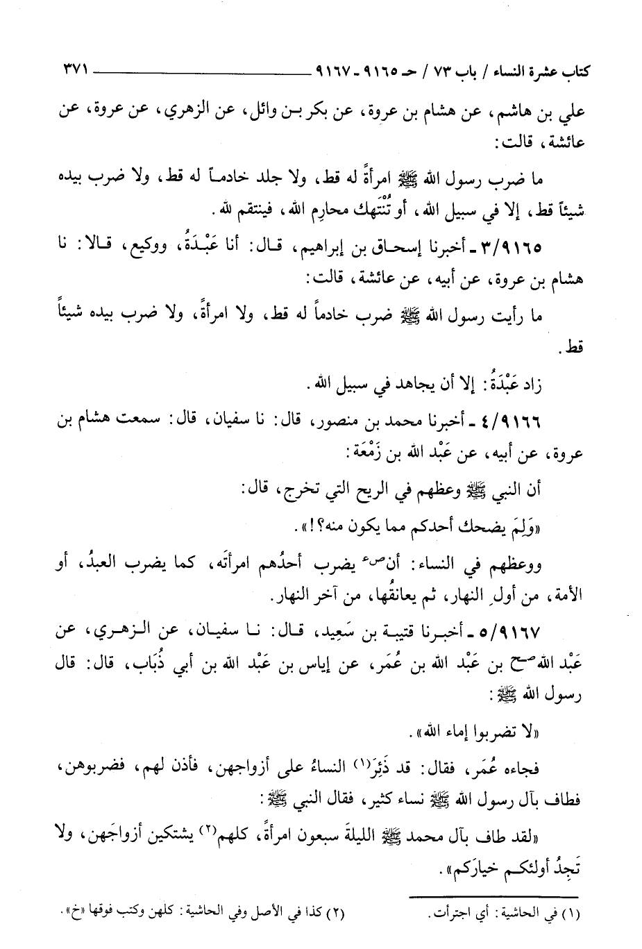 9165 - أخبرنا إسحاق بن إبراهيم قال أنا عبدة ووكيع قالا نا هشام بن عروة عن أبيه عن عائشة قالت : ما رأيت رسول الله صلى الله عليه و سلم ضرب خادما له قط ولا امرأة ولا ضرب بيده شيئا قط زاد عبدة إلا أن يجاهد في سبيل الله