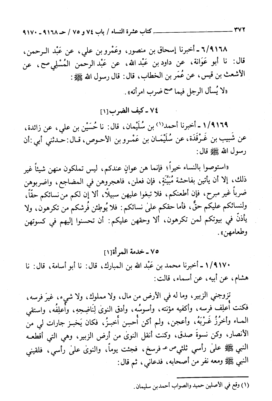 9170 - أخبرنا محمد بن عبد الله بن المبارك قال نا أبو أسامة قال نا هشام عن أبيه عن أسماء قالت : تزوجني الزبير وما له في الأرض من مال ولا مملوك ولا شيء غير فرسه فكنت أعلف فرسه وأكفيه مؤنته وأسوسه وأدق النوى لناضحه وأعلفه وأستقي الماء وأخرز غربه وأعجن ولم أكن أحسن أخبز فكان يخبز جارات لي من الأنصار وكن نسوة صدق وكنت أنقل النوى من أرض الزبير وهي التي أقطعه النبي صلى الله عليه و سلم على رأسي ثلثي فرسخ فجئت يوما والنوى على رأسي فلقيني النبي صلى الله عليه و سلم ومعه نفر من أصحابه فدعاني ثم قال إخ إخ ليحملني خلفه فاستحييت أنى أسير مع الرجال وذكرت الزبير وغيرته وكان من أغير الناس فعرف رسول الله أني قد استحييت فمضى فجئت إلى الزبير فقلت لقيني رسول الله صلى الله عليه و سلم وعلى رأسي النوى ومعه نفر من أصحابه فأناخ لأركب معه فاستحييت وعرفت غيرتك فقال والله لحملك النوى كان أشد من ركوبك معه قالت حتى أرسل إلي أبو بكر بعد ذلك بخادم فكفتني سياسة الفرس فكأنما أعتقني