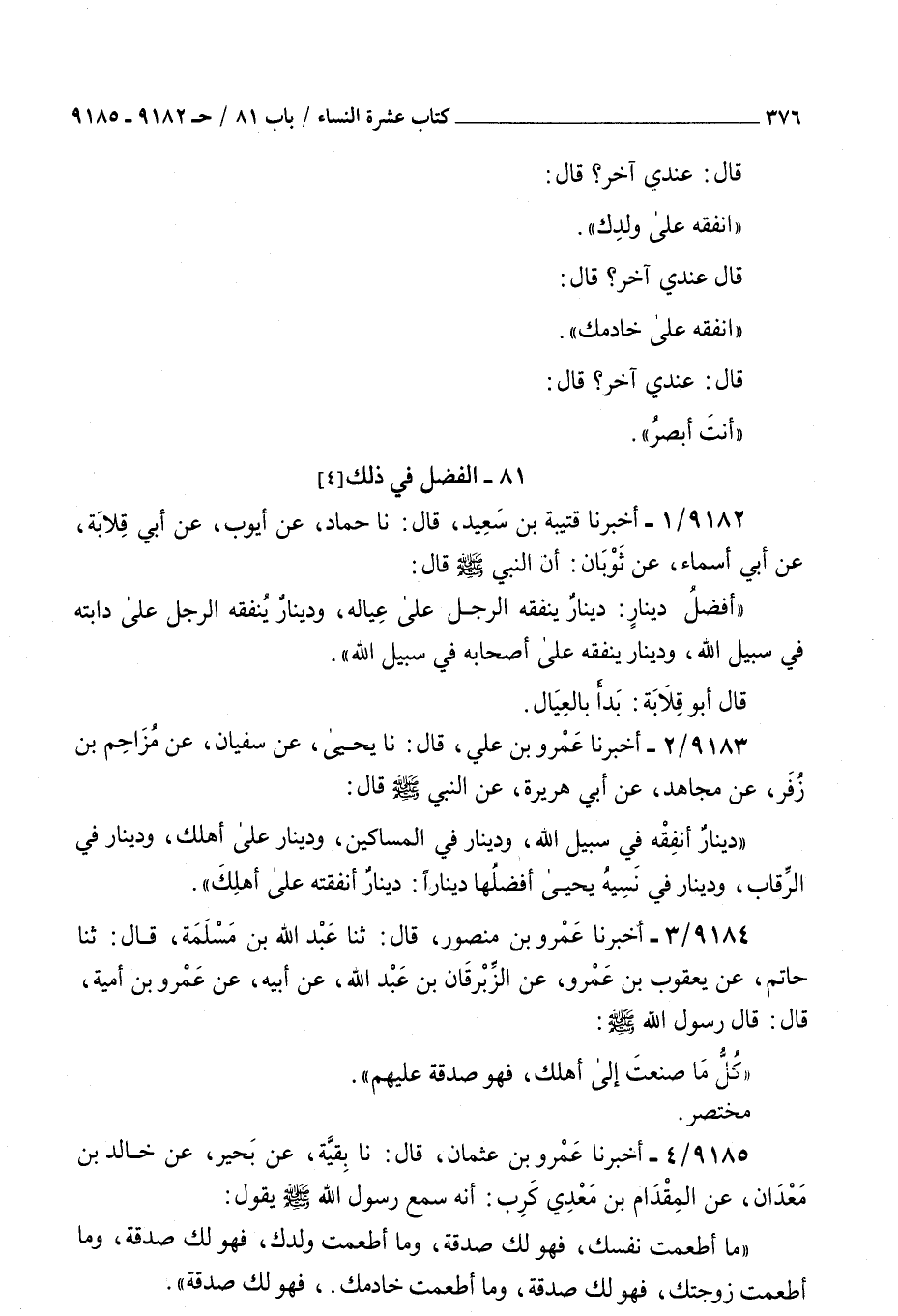 9182 - أخبرنا قتيبة بن سعيد قال نا حماد عن أيوب عن أبي قلابة عن أبي أسماء عن ثوبان أن النبي صلى الله عليه و سلم قال : أفضل دينار دينار ينفقه الرجل على عياله ودينار ينفقه الرجل على دابته في سبيل الله ودينار ينفقه على أصحابه في سبيل الله قال أبو قلابة بدأ بالعيال