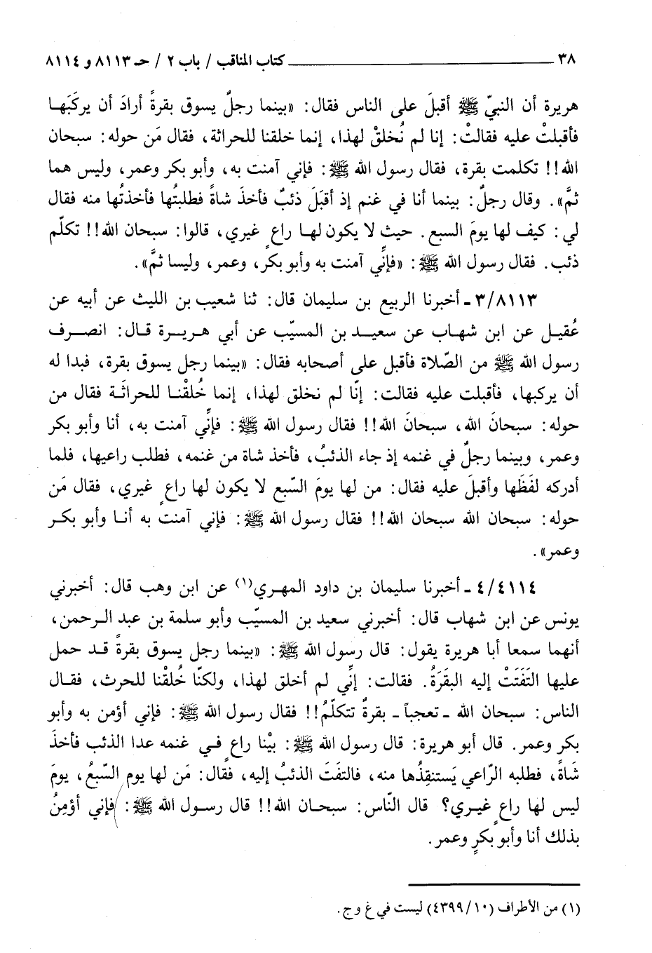 8113 - أخبرنا الربيع بن سليمان قال ثنا شعيب بن الليث عن أبيه عن عقيل عن بن شهاب عن سعيد بن المسيب عن أبي هريرة قال : انصرف رسول الله صلى الله عليه و سلم من الصلاة فأقبل على أصحابه فقال بينما رجل يسوق بقرة فبدا له أن يركبها فأقبلت عليه فقالت إنا لم نخلق لهذا إنما خلقنا للحراثة فقال من حوله سبحان الله سبحان الله فقال رسول الله صلى الله عليه و سلم فإني آمنت به أنا وأبو بكر وعمر وبينما رجل في غنمه إذ جاء الذئب فأخذ شاة من غنمه فطلب راعيها فلما أدركه لفظها وأقبل عليه فقال من لها يوم السبع لا يكون لها راع غيري فقال من حوله سبحان الله سبحان الله فقال رسول الله صلى الله عليه و سلم فإني آمنت به أنا وأبو بكر وعمر