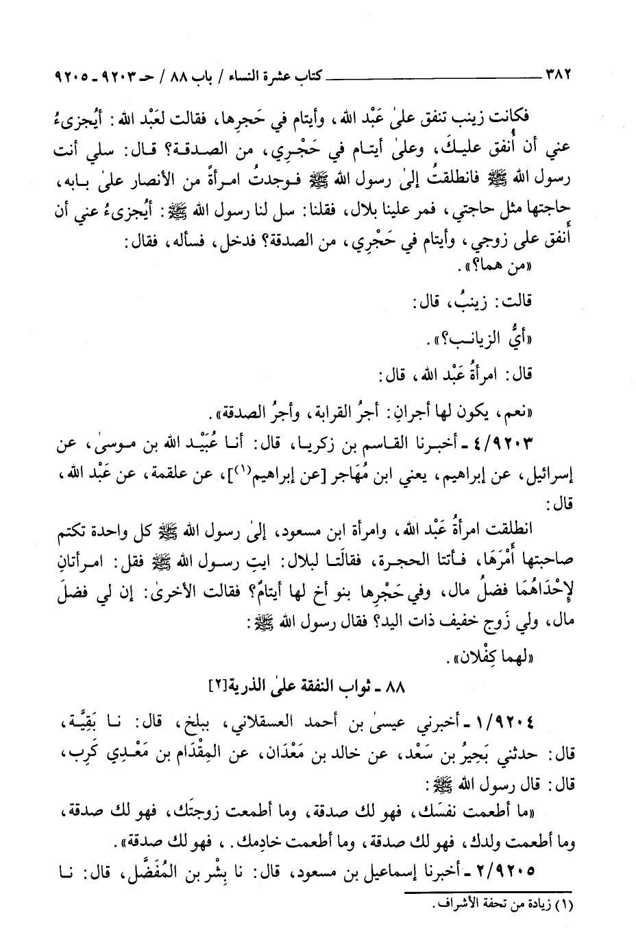 9203 - أخبرنا القاسم بن زكريا قال أنا عبيد الله بن موسى عن إسرائيل عن إبراهيم يعني بن مهاجر عن إبراهيم عن علقمة عن عبد الله قال : انطلقت امرأة عبد الله وامرأة بن مسعود إلى رسول الله صلى الله عليه و سلم كل واحدة تكتم صاحبتها أمرها فأتتا الحجرة فقالتا لبلال ايت رسول الله صلى الله عليه و سلم فقل امرأتان لإحداهما فضل مال وفي حجرها بنو أخ لها أيتام فقالت الأخرى إن لي فضل مال ولي زوج خفيف ذات اليد فقال رسول الله صلى الله عليه و سلم لهما كفلان