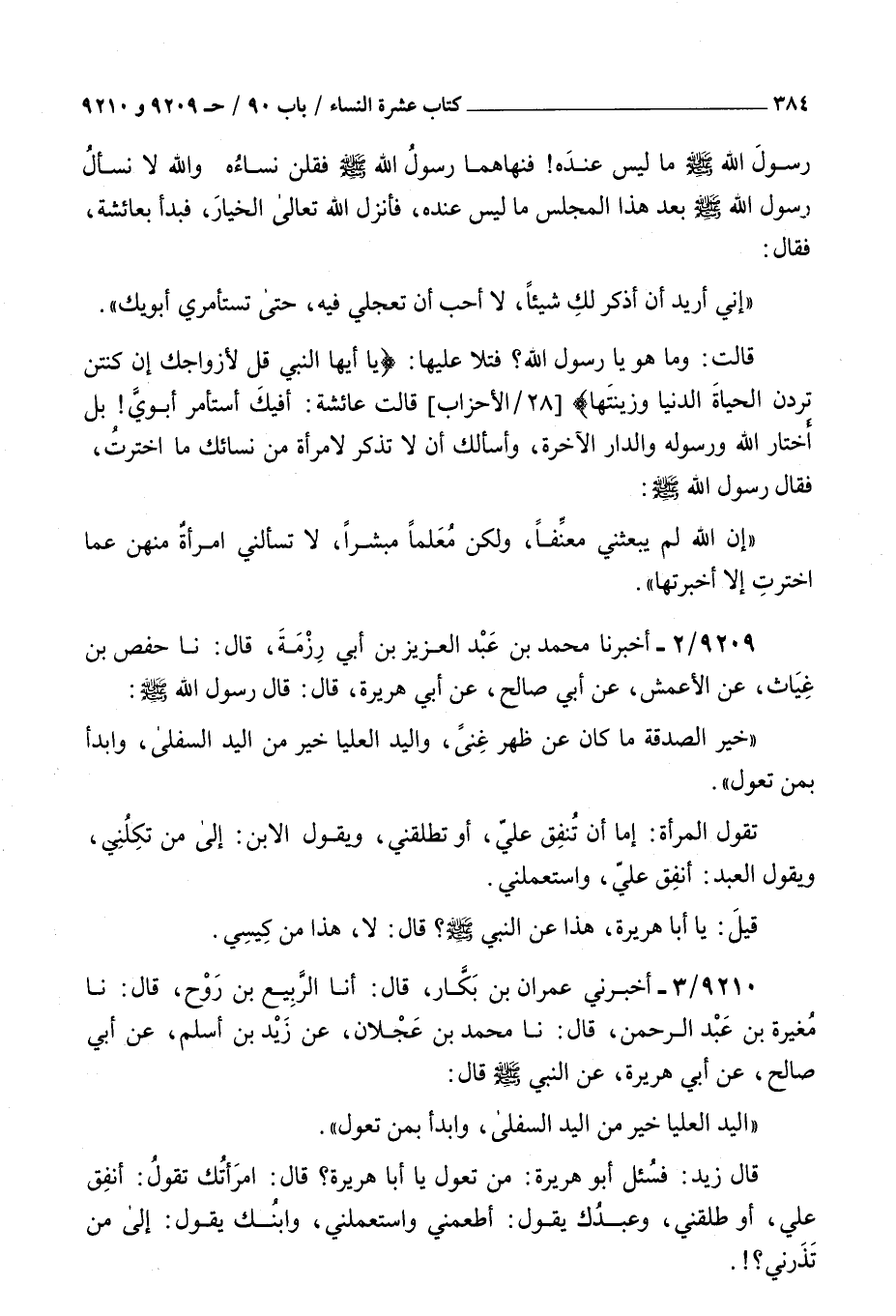 9210 - أخبرني عمران بن بكار قال أنا الربيع بن روح قال نا مغيرة بن عبد الرحمن قال نا محمد بن عجلان عن زيد بن أسلم عن أبي صالح عن أبي هريرة عن النبي صلى الله عليه و سلم قال : اليد العليا خير من اليد السفلى وابدأ بمن تعول قال زيد فسئل أبو هريرة من تعول يا أبا هريرة قال امرأتك تقول أنفق علي أو طلقني وعبدك يقول أطعمني واستعملني وابنك يقول إلى من تذرني