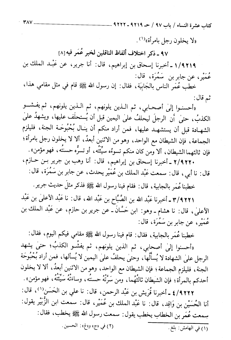 9221 - أخبرنا عبد الله بن الصباح بن عبد الله قال نا عبد الأعلى بن عبد الأعلى قال نا هشام وهو بن حسان عن جرير بن حازم عن عبد الملك بن عمير عن جابر بن سمرة قال خطبنا عمر بالجابية فقال : قام فينا رسول الله صلى الله عليه و سلم مقامي فيكم اليوم فقال أحسنوا إلى أصحابي ثم الذين يلونهم ثم يفشو الكذب حتى يشهد الرجل على الشهادة لا يسألها وحتى يحلف على اليمين لا يسألها فمن أراد بحبوحة الجنة فليلزم الجماعة فإن الشيطان مع الواحد وهو من الإثنين أبعد ألا لا يخلون أحدكم بالمرأة فإن الشيطان ثالثهما ومن سرته حسنته وسائته سيئته فهو مؤمن
