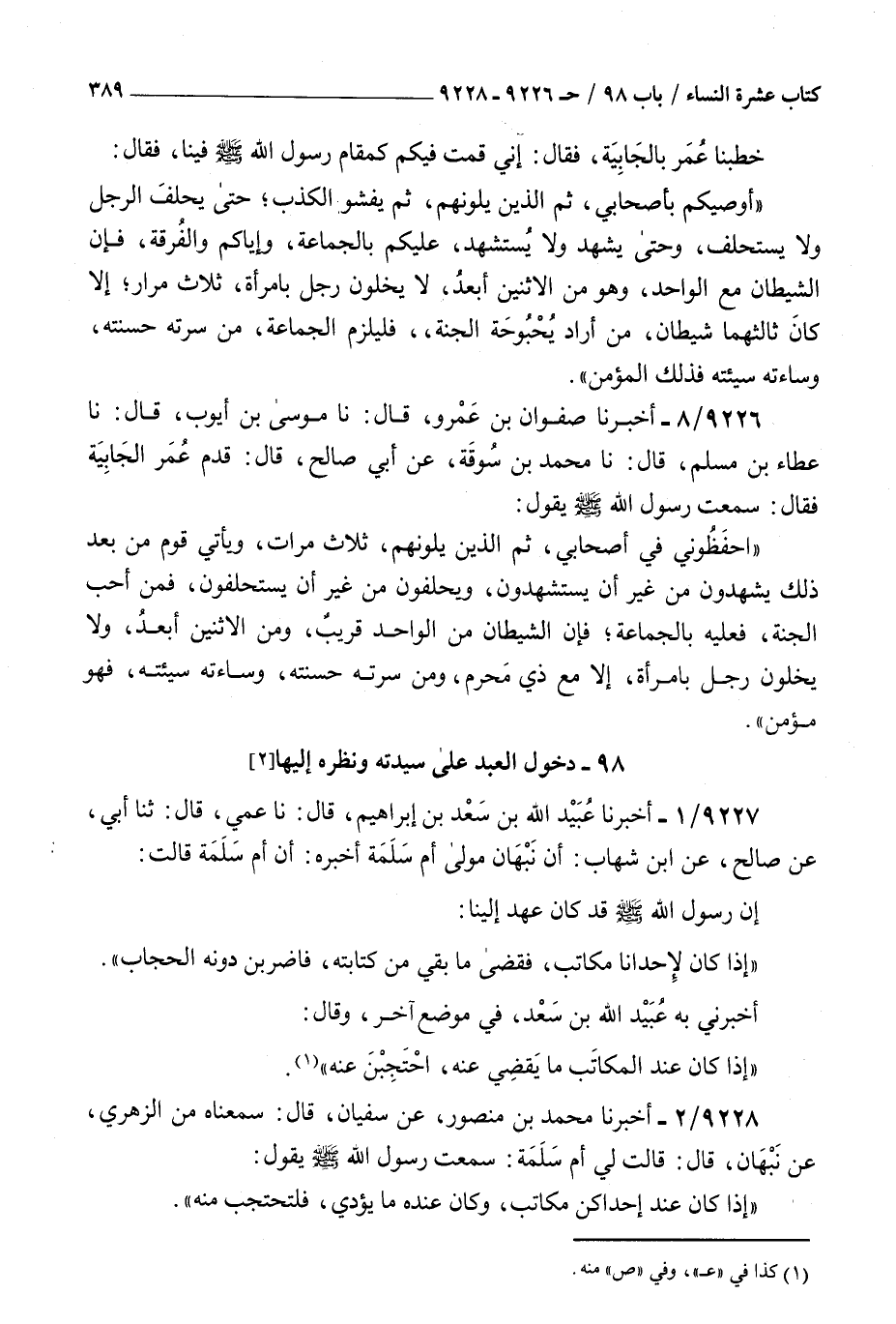9226 - أخبرنا صفوان بن عمرو قال نا موسى بن أيوب قال نا عطاء بن مسلم قال نا محمد بن سوقة عن أبي صالح قال قدم عمر الجابية فقال سمعت رسول الله صلى الله عليه و سلم يقول : احفظوني في أصحابي ثم الذين يلونهم ثلاث مرات ويأتي قوم من بعد ذلك يشهدون من غير أن يستشهدون ويحلفون من غير أن يستحلفون فمن أحب الجنة فعليه بالجماعة فإن الشيطان من الواحد قريب ومن الإثنين أبعد ولا يخلون رجل بامرأة إلا مع ذي محرم ومن سرته حسنته وساءته سيئته فهو مؤمن