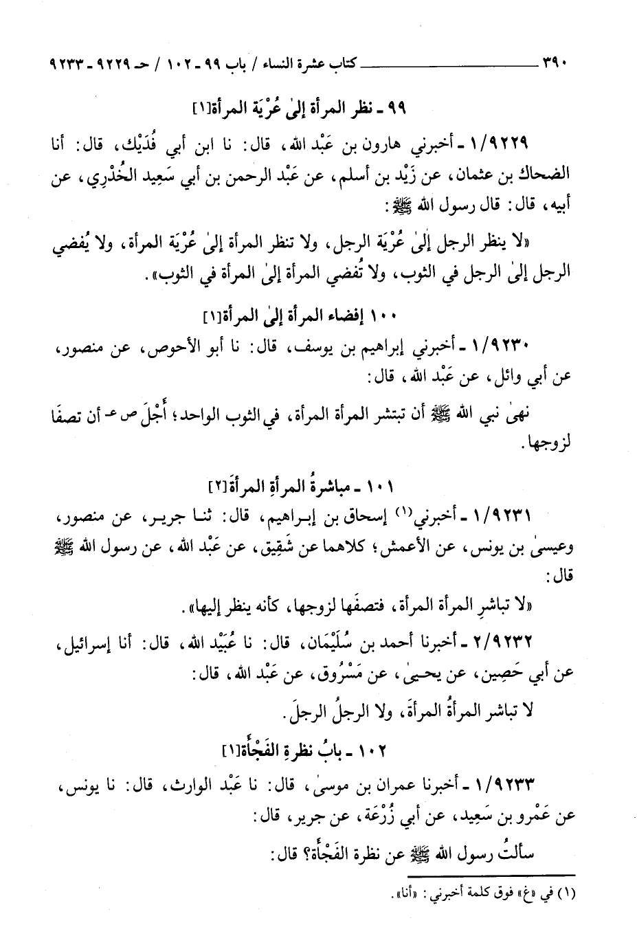 9233 - أخبرنا عمران بن موسى قال نا عبد الوارث قال نا يونس عن عمرو بن سعيد عن أبي زرعة عن جرير قال : سألت رسول الله صلى الله عليه و سلم عن نظرة الفجأة قال غض بصرك