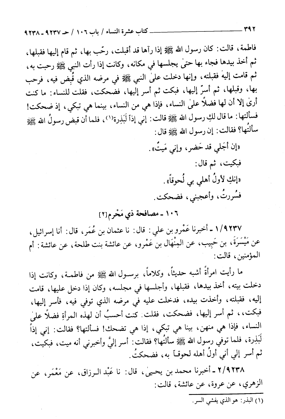 9237 - أخبرنا عمرو بن علي قال نا عثمان بن عمر قال أنا إسرائيل عن ميسرة بن حبيب عن المنهال بن عمرو عن عائشة بنت طلحة عن عائشة أم المؤمنين قالت : ما رأيت امرأة أشبه حديثا وكلاما برسول الله صلى الله عليه و سلم من فاطمة وكانت إذا دخلت بيته أخذ بيدها فقبلها وأجلسها في مجلسه وكان إذا دخل عليها قامت إليه فقبلته وأخذت بيده فدخلت عليه في مرضه الذي توفي فيه فأسر إليها فبكت ثم أسر إليها فضحكت فقلت كنت أحسب أن لهذه المرأة فضلا على النساء فإذا هي منهن بينا هي تبكي إذا هي تضحك فسألتها فقالت إني إذا لبذرة فلما توفي رسول الله صلى الله عليه و سلم سألتها فقالت أسر إلي وأخبرني أنه ميت فبكيت ثم أسر إلي أني أول أهله لحوقا به فضحكت