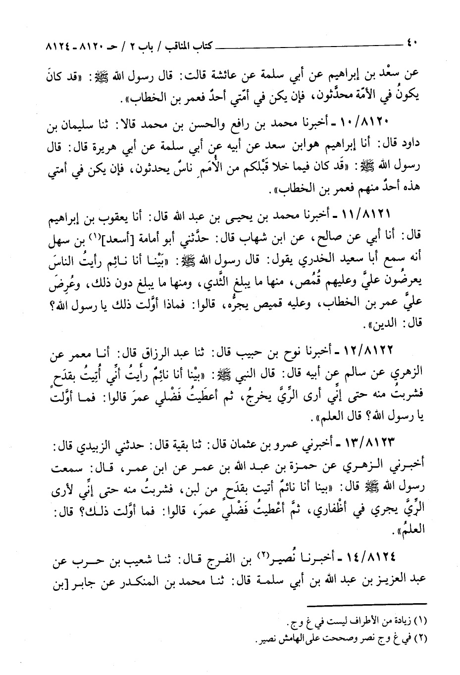 8120 - أخبرنا محمد بن رافع والحسن بن محمد قالا ثنا سليمان بن داود قال أنا إبراهيم هو بن سعد عن أبيه عن أبي سلمة عن أبي هريرة قال قال رسول الله صلى الله عليه و سلم : قد كان فيما خلا قبلكم من الأمم ناس يحدثون فإن يكن في أمتي هذه أحد منهم فعمر بن الخطاب