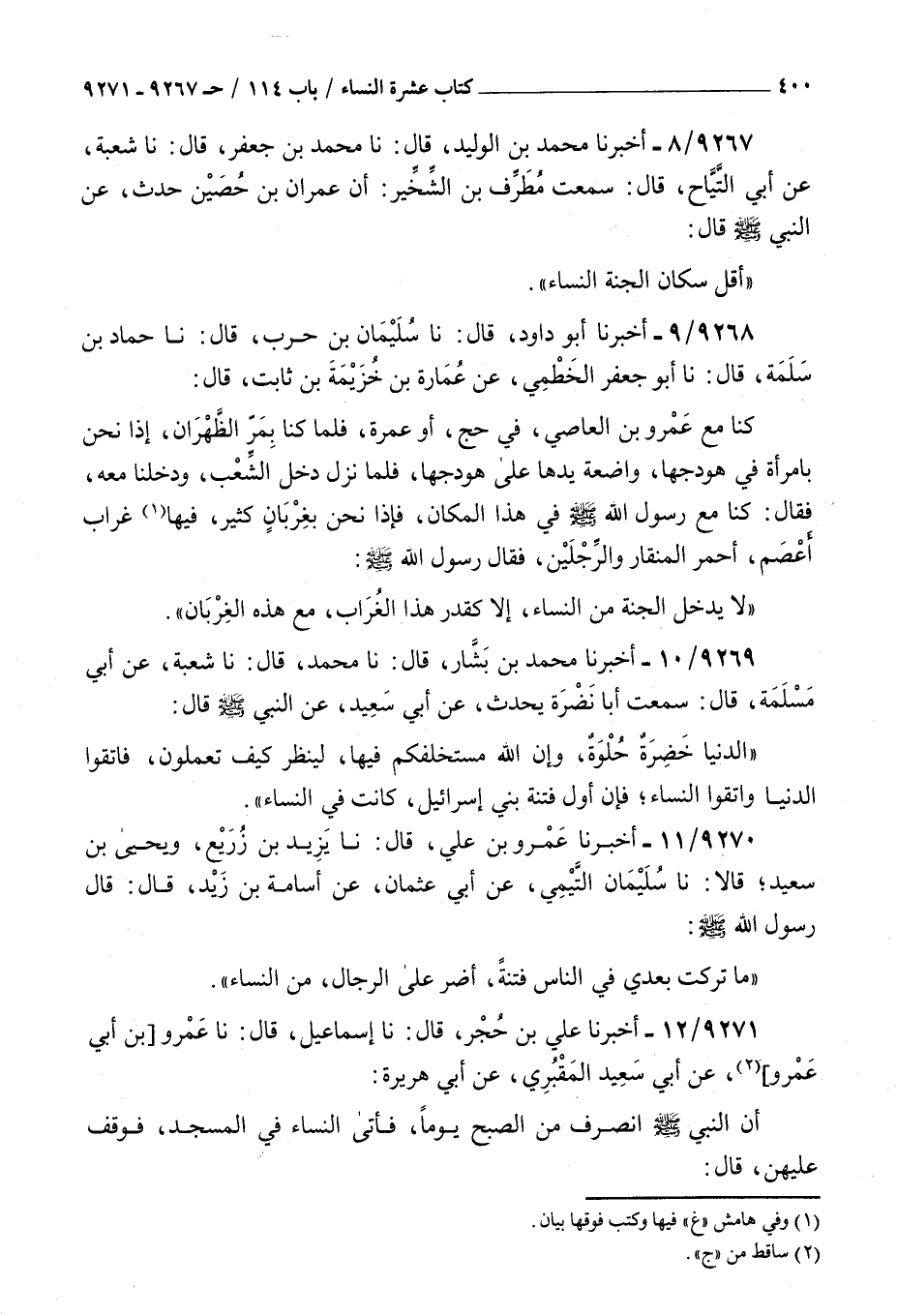 9267 - أخبرنا محمد بن الوليد قال نا محمد بن جعفر قال نا شعبة عن أبي التياح قال سمعت مطرف بن الشخير أن عمران بن حصين حدث عن النبي صلى الله عليه و سلم قال : أقل سكان الجنة النساء