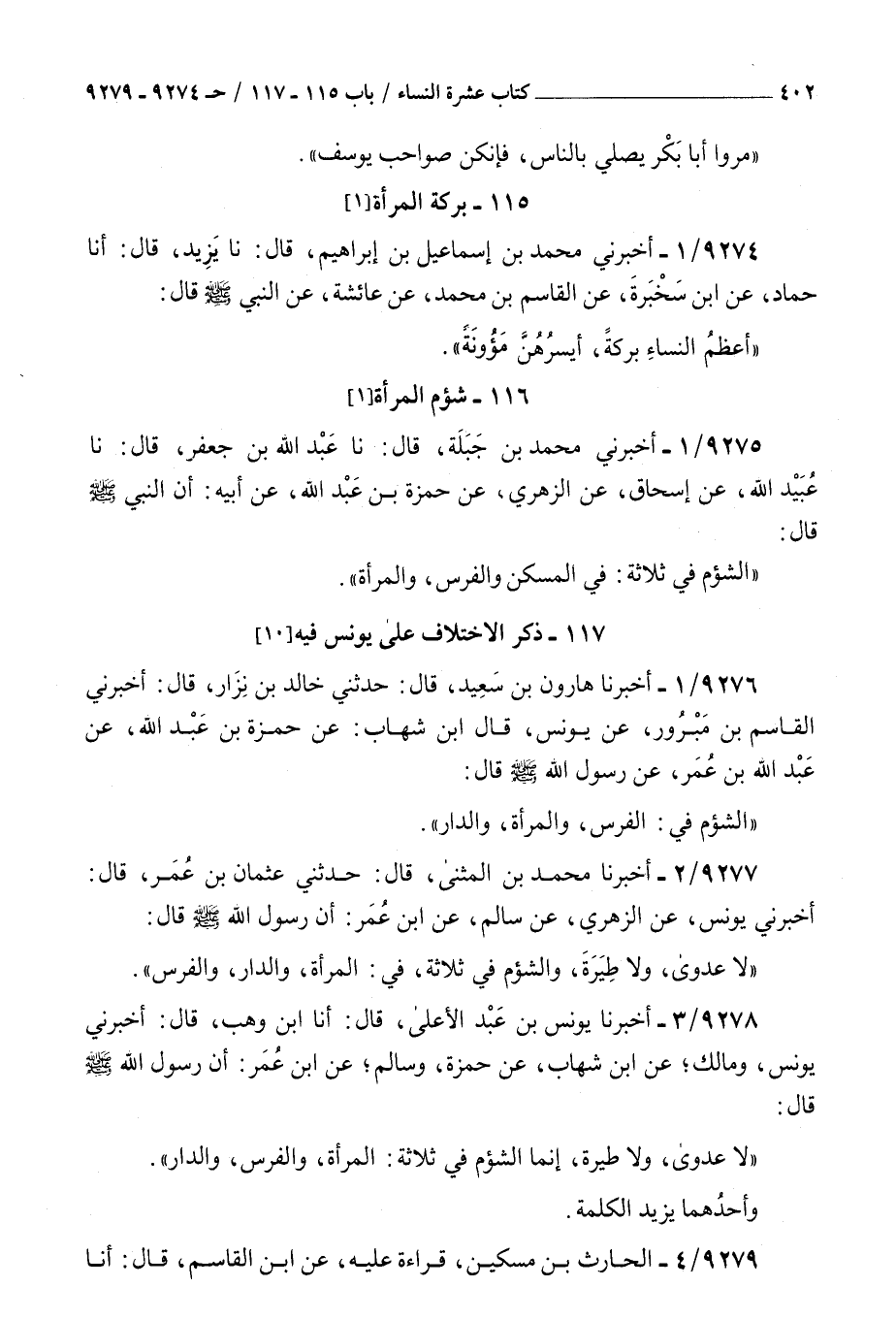9276 - أخبرنا هارون بن سعيد قال حدثني خالد بن نزار قال أخبرني القاسم بن مبرور عن يونس قال بن شهاب عن حمزة بن عبد الله عن عبد الله بن عمر عن رسول الله صلى الله عليه و سلم قال : الشؤم في الفرس والمرأة والدار