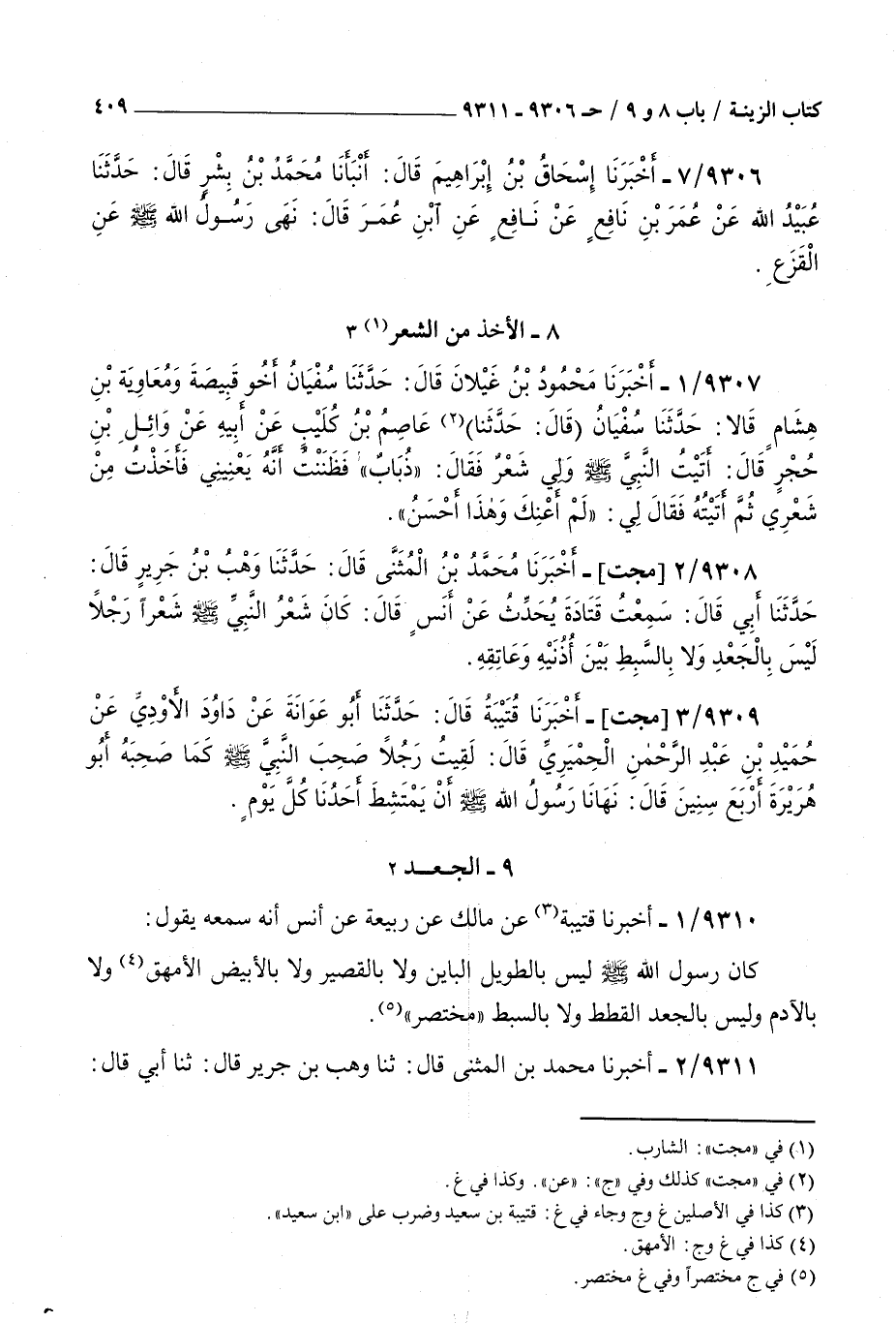 9311 - أخبرنا محمد بن المثنى قال ثنا وهب بن جرير قال ثنا أبي قال سمعت قتادة يحدث عن أنس قال : كان شعر رسول الله صلى الله عليه و سلم شعرا رجلا ليس بالجعد ولا بالسبط بين أذنيه وعاتقيه