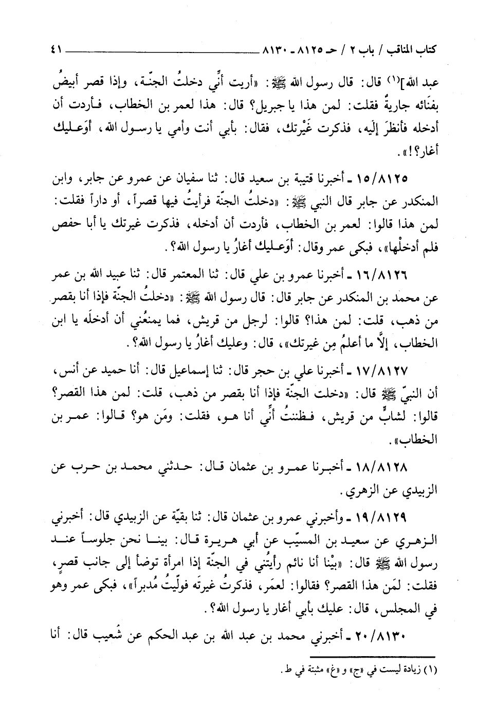 8126 - أخبرنا عمرو بن علي قال ثنا المعتمر قال ثنا عبيد الله بن عمر عن محمد بن المنكدر عن جابر قال قال رسول الله صلى الله عليه و سلم : دخلت الجنة فإذا أنا بقصر من ذهب قلت لمن هذا قالوا لرجل من قريش فما يمنعني أن أدخله يا بن الخطاب إلا ما أعلم من غيرتك قال وعليك أغار يا رسول الله