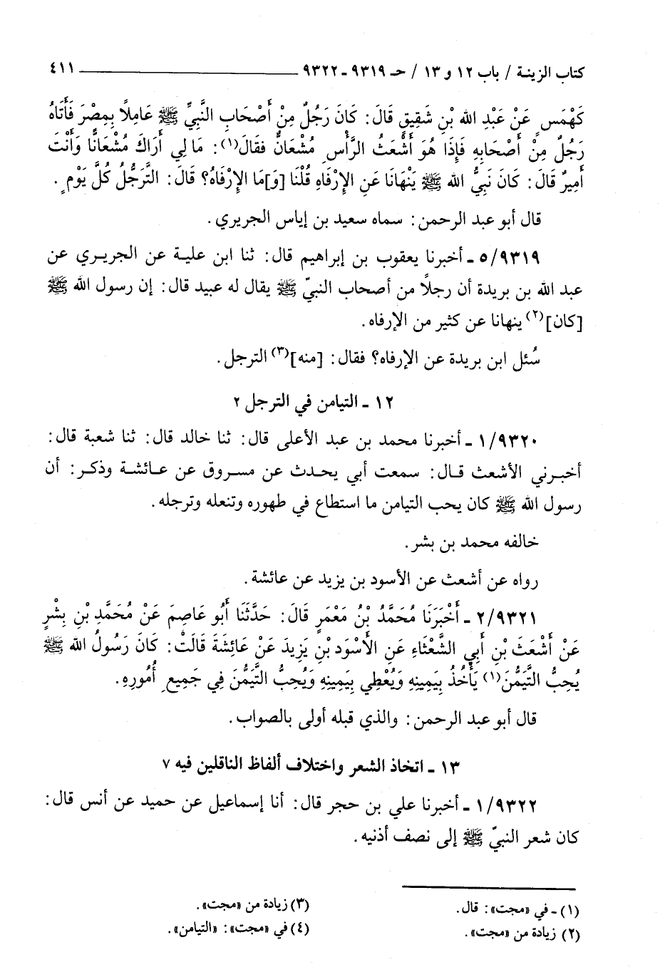 9319 - أخبرنا يعقوب بن إبراهيم قال ثنا بن علية عن الجريري عن عبد الله بن بريدة أن رجلا من أصحاب النبي صلى الله عليه و سلم يقال له عبيد قال : إن رسول الله صلى الله عليه و سلم كان ينهانا عن كثير من الإرفاه سئل بن بريدة عن الإرفاه فقال منه الترجل