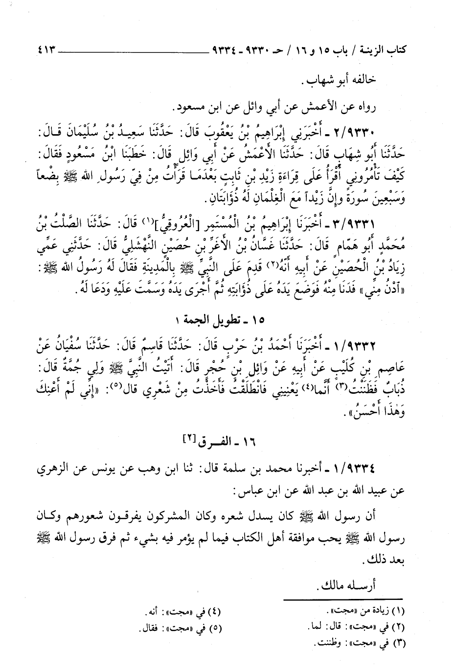 9330 - أخبرني إبراهيم بن يعقوب قال حدثنا سعيد بن سليمان قال حدثنا أبو شهاب قال حدثنا الأعمش عن أبي وائل قال خطبنا بن مسعود فقال : كيف تأمروني أقرأ على قراءة زيد بن ثابت بعدما قرأت من في رسول الله صلى الله عليه و سلم بضعا وسبعين سورة وإن زيدا مع الغلمان له ذؤابتان