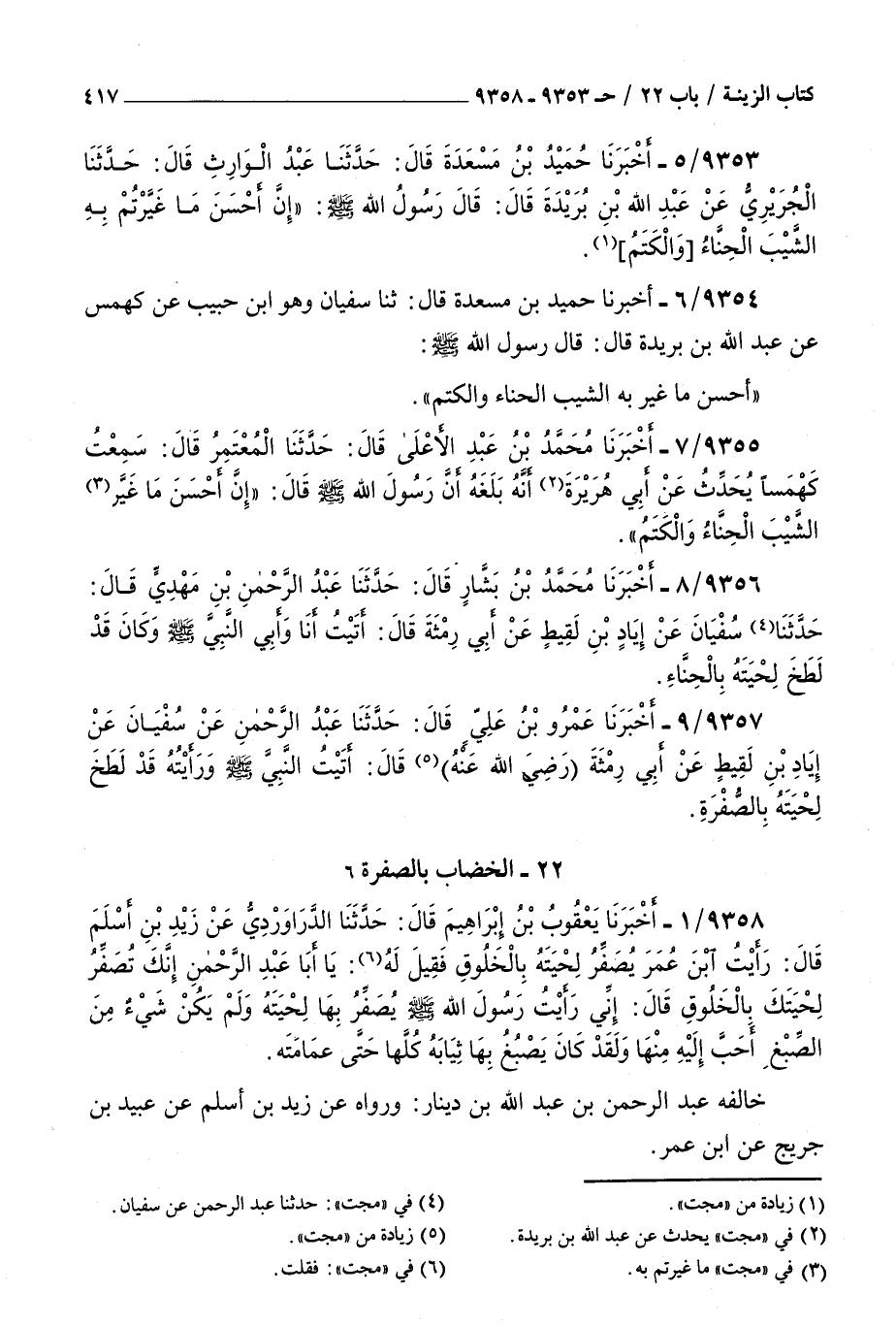 9353 - أخبرنا حميد بن مسعدة قال حدثنا عبد الوارث قال حدثنا الجريري عن عبد الله بن بريدة قال قال رسول الله صلى الله عليه و سلم : إن أحسن ما غيرتم به الشيب الحناء والكتم