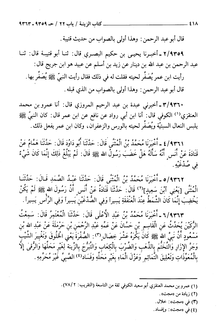 9359 - أخبرنا يحيى بن حكيم البصري قال ثنا أبو قتيبة قال ثنا عبد الرحمن بن عبد الله بن دينار عن زيد بن أسلم عن عبيد هو بن جريج قال رأيت بن عمر يصفر لحيته فقلت له في ذلك فقال : رأيت النبي صلى الله عليه و سلم يصفر بها قال أبو عبد الرحمن وهذا أولى بالصواب من الذي قبله