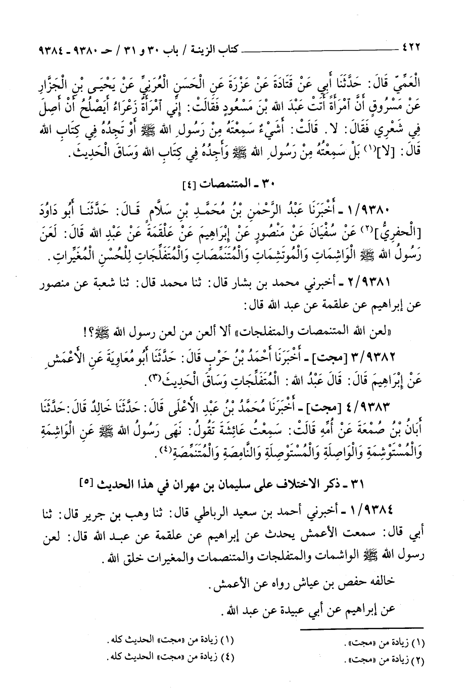 9380 - أخبرنا عبد الرحمن بن محمد بن سلام قال حدثنا أبو داود الحفري عن سفيان عن منصور عن إبراهيم عن علقمة عن عبد الله قال : لعن رسول الله صلى الله عليه و سلم الواشمات والموتشمات والمتنمصات والمتفلجات للحسن المغيرات
