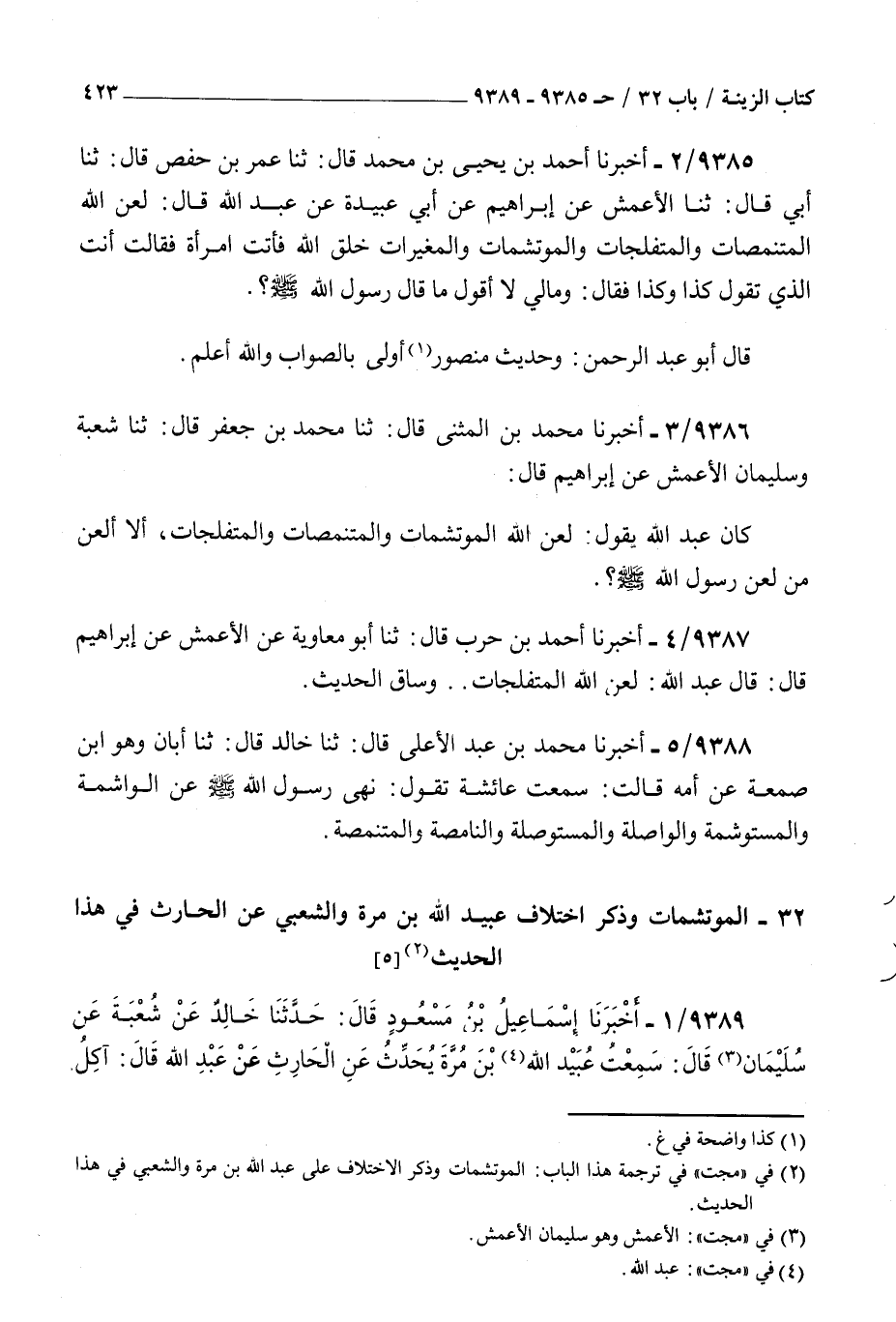 9387 - أخبرنا أحمد بن حرب قال ثنا أبو معاوية عن الأعمش عن إبراهيم قال قال عبد الله : لعن الله المتفلجات وساق الحديث
