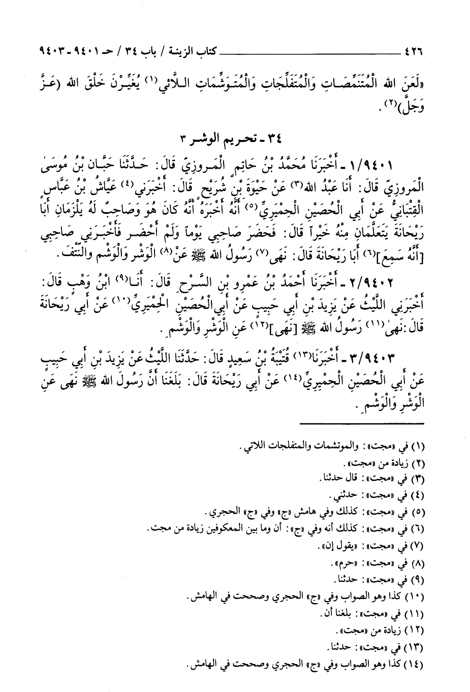 9402 - أخبرنا أحمد بن عمرو بن السرح قال أنا بن وهب قال أخبرني الليث عن يزيد بن أبي حبيب عن أبي الحصين الحميري عن أبي ريحانة قال : نهى رسول الله صلى الله عليه و سلم عن الوشر والوشم