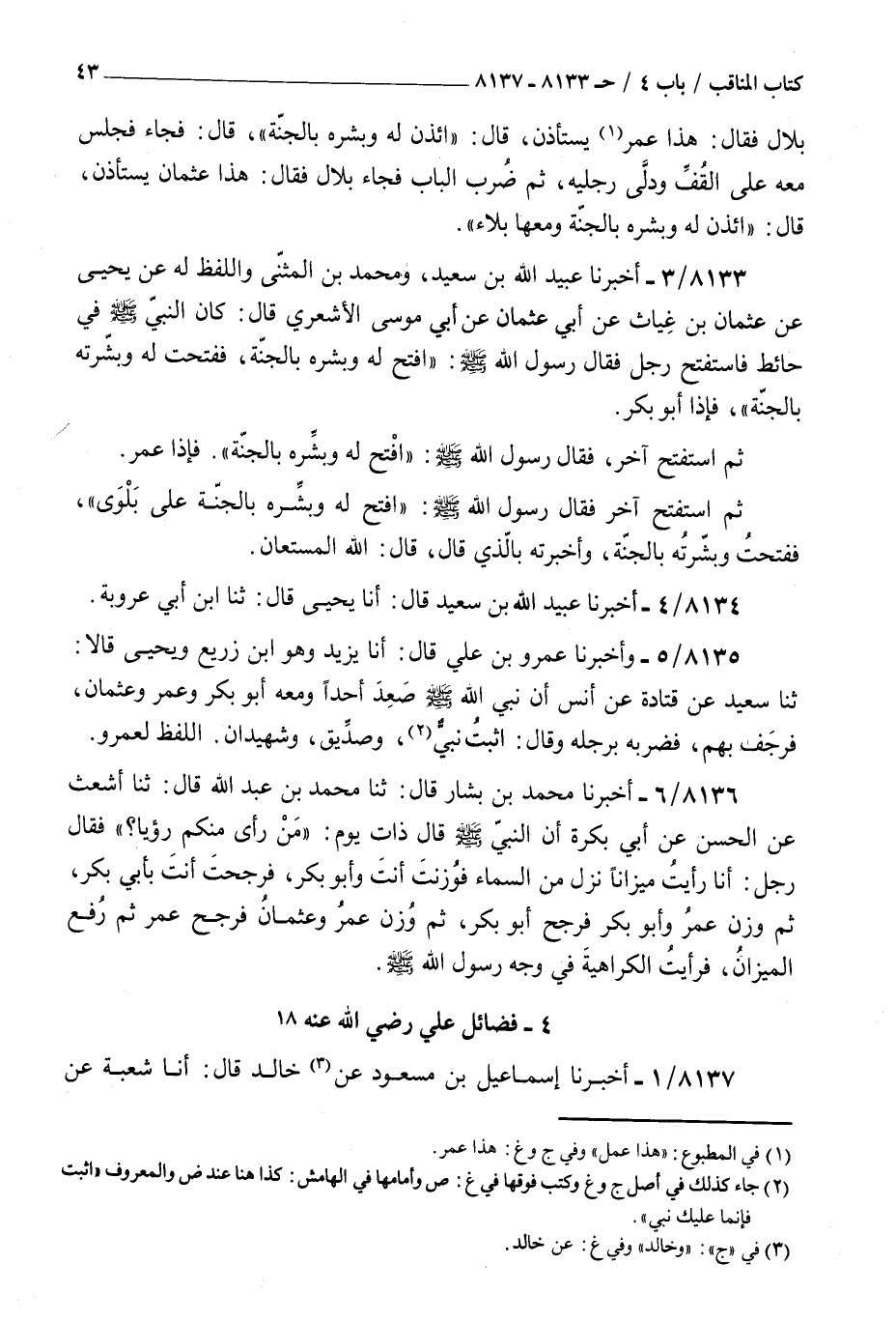 8133 - أخبرنا عبيد الله بن سعيد ومحمد بن المثنى واللفظ له عن يحيى عن عثمان بن غياث عن أبي عثمان عن أبي موسى الأشعري قال : كان النبي صلى الله عليه و سلم في حائط فاستفتح رجل فقال رسول الله صلى الله عليه و سلم افتح له وبشره بالجنة ففتحت له وبشرته بالجنة فإذا أبو بكر ثم استفتح آخر فقال رسول الله صلى الله عليه و سلم افتح له وبشره بالجنة فإذا عمر ثم استفتح آخر فقال رسول الله صلى الله عليه و سلم افتح له وبشره بالجنة على بلوى ففتحت وبشرته بالجنة وأخبرته بالذي قال قال الله المستعان