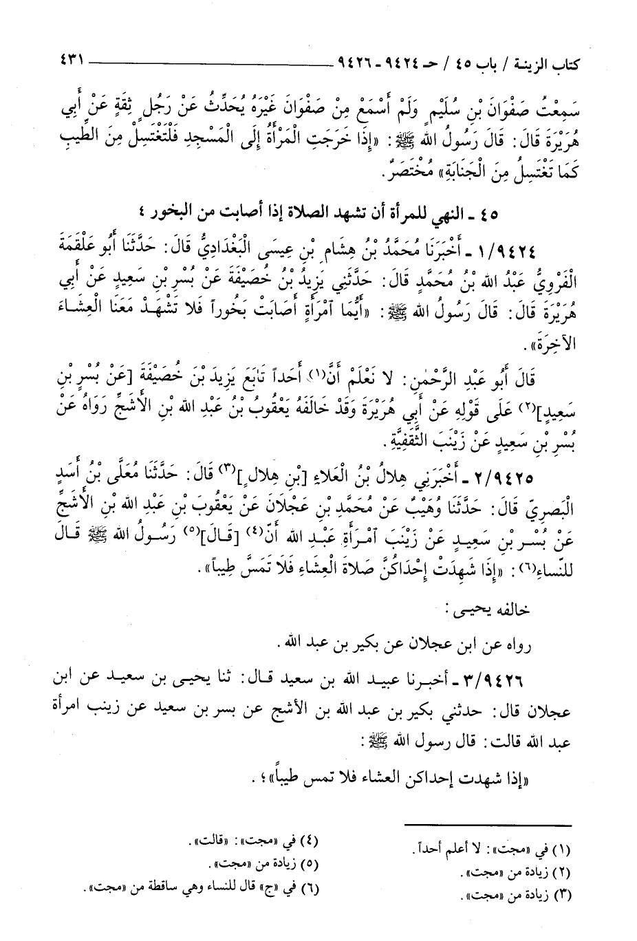 9426 - أخبرنا عبيد الله بن سعيد قال ثنا يحيى بن سعيد عن بن عجلان قال حدثني بكير بن عبد الله بن الأشج عن بسر بن سعيد عن زينب امرأة عبد الله قالت قال رسول الله صلى الله عليه و سلم : إذا شهدت إحداكن العشاء فلا تمس طيبا