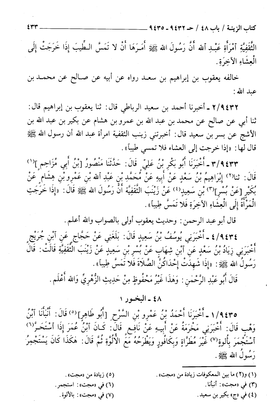 9433 - أخبرنا أبو بكر بن علي قال حدثنا منصور بن أبي مزاحم قال ثنا إبراهيم بن سعد عن أبيه عن محمد بن عبد الله بن عمرو بن هشام عن بكير عن بسر بن سعيد عن زينب الثقفية أن رسول الله صلى الله عليه و سلم قال : إذا خرجت المرأة إلى العشاء الآخرة فلا تمس طيبا قال أبو عبد الرحمن وحديث يعقوب أولى بالصواب والله أعلم