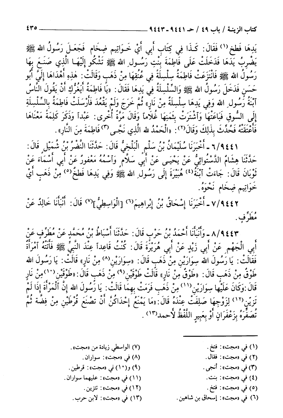 9443 - وأنبأنا أحمد بن حرب قال حدثنا أسباط بن محمد عن مطرف عن أبي الجهم عن أبي زيد عن أبي هريرة قال : كنت قاعدا عند النبي صلى الله عليه و سلم فأتته امرأة فقالت يا رسول الله سوارين من ذهب قال سوارين من نار قالت يا رسول الله طوق من ذهب قال طوق من نار قالت طوقين من ذهب قال طوقين من نار قال وكان عليها سوارين من ذهب فرمت بهما قالت يا رسول الله إن المرأة إذا لم تزين لزوجها صلفت عنده قال ما يمنع إحداكن أن تصنع قرطين من فضة ثم تصفره بزعفران أو بعبير اللفظ لأحمد