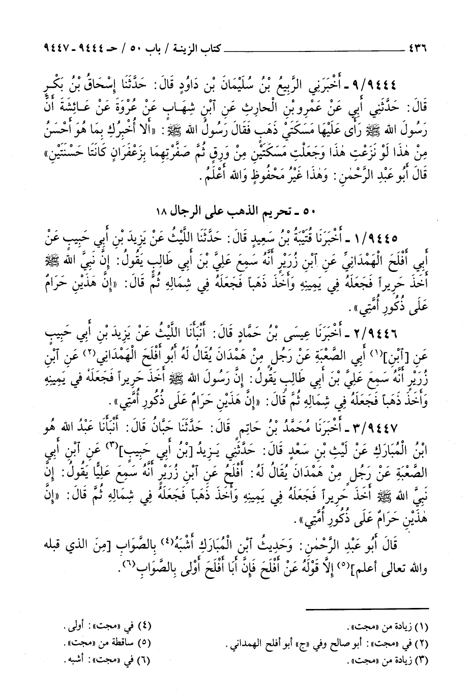 9446 - أخبرنا عيسى بن حماد قال أنبأنا الليث عن يزيد بن أبي حبيب عن بن أبي الصعبة عن رجل من همدان يقال له أبو أفلح الهمداني عن بن زرير أنه سمع علي بن أبي طالب يقول : إن رسول الله صلى الله عليه و سلم أخذ حريرا فجعله في يمينه وأخذ ذهبا فجعله في شماله ثم قال إن هذين حرام على ذكور أمتي