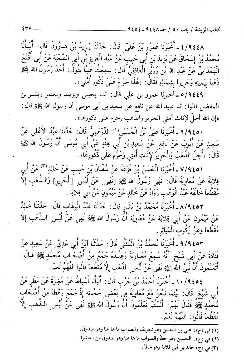 9449 - أخبرنا عمرو بن علي قال ثنا يحيى ويزيد ومعتمر وبشر بن المفضل قالوا ثنا عبيد الله عن نافع عن سعيد بن أبي موسى أن رسول الله صلى الله عليه و سلم قال : إن الله أحل لإناث أمتي الحرير والذهب وحرم على ذكورها