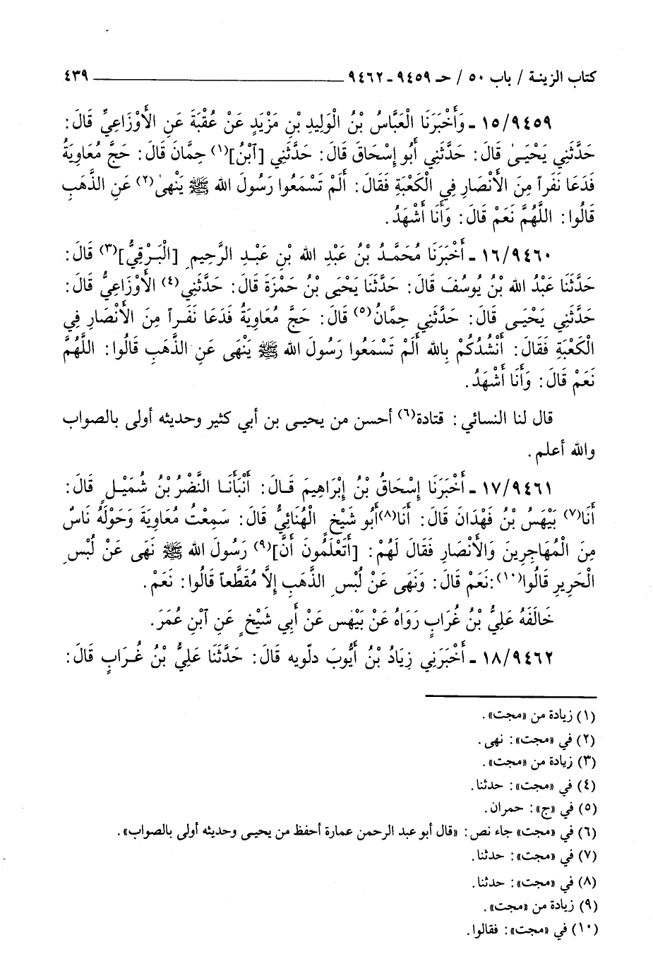 9459 - وأخبرنا العباس بن الوليد بن مزيد عن عقبة عن الأوزاعي قال حدثني يحيى قال حدثني أبو إسحاق قال حدثني بن حمان قال حج معاوية فدعا نفرا من الأنصار في الكعبة فقال : ألم تسمعوا رسول الله صلى الله عليه و سلم ينهى عن الذهب قالوا اللهم نعم قال وأنا أشهد