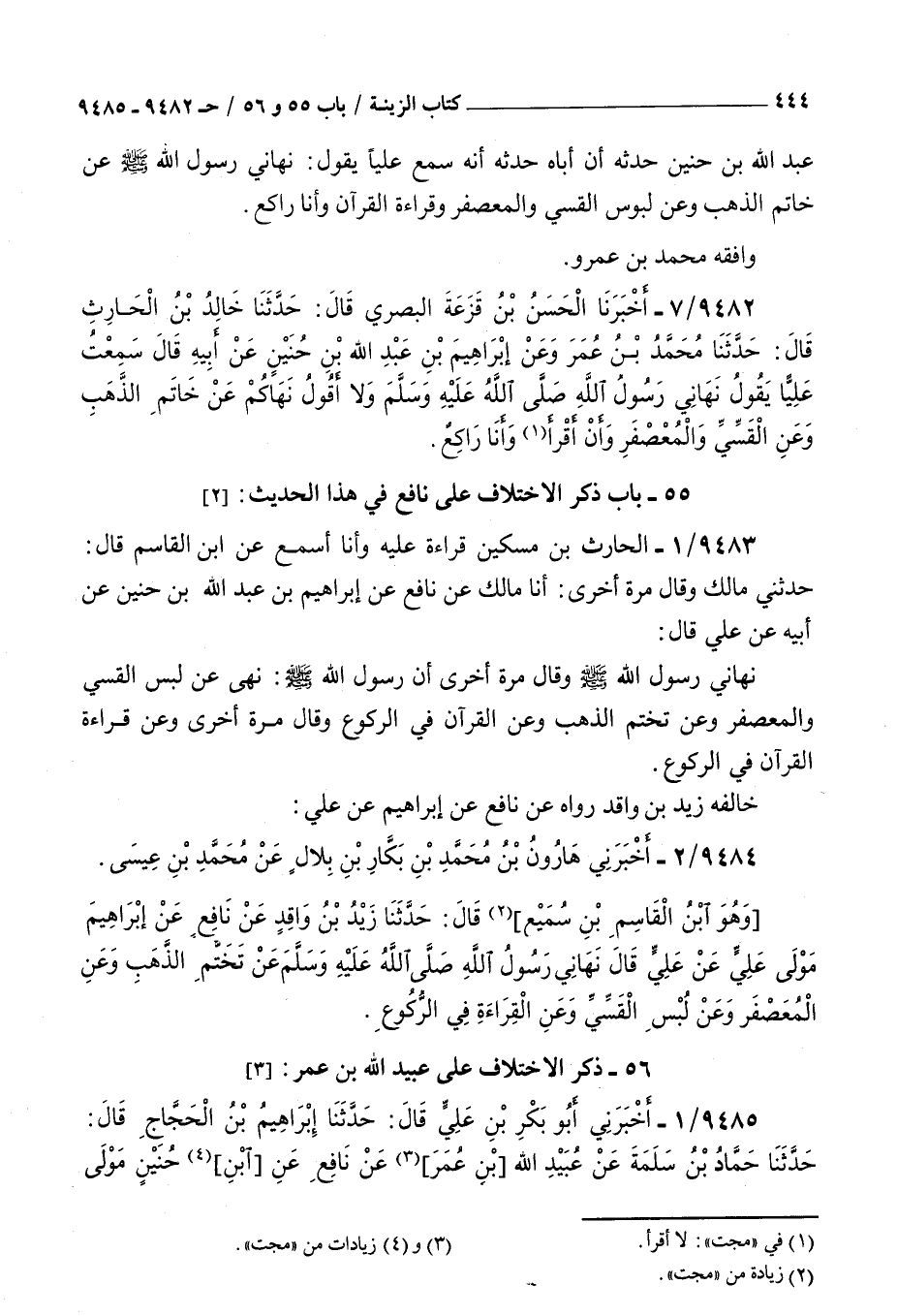 9484 - أخبرني هارون بن محمد بن بكار بن بلال عن محمد بن عيسى وهو بن القاسم بن سميع قال حدثنا زيد بن واقد عن نافع عن إبراهيم مولى علي عن علي قال : نهاني رسول الله صلى الله عليه و سلم عن تختم الذهب وعن المعصفر وعن لبس القسي وعن القراءة في الركوع