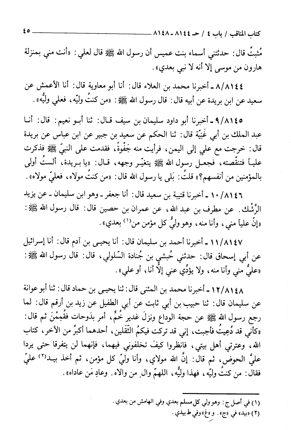 8148 - أخبرنا محمد بن المثنى قال ثنا يحيى بن حماد قال ثنا أبو عوانة عن سليمان قال ثنا حبيب بن أبي ثابت عن أبي الطفيل عن زيد بن أرقم قال : لما رجع رسول الله صلى الله عليه و سلم عن حجة الوداع ونزل غدير خم أمر بدوحات فقممن ثم قال كأني قد دعيت فأجبت إني قد تركت فيكم الثقلين أحدهما أكبر من الآخر كتاب الله وعترتي أهل بيتي فانظروا كيف تخلفوني فيهما فإنهما لن يتفرقا حتى يردا علي الحوض ثم قال إن الله مولاي وأنا ولي كل مؤمن ثم أخذ بيد علي فقال من كنت وليه فهذا وليه اللهم وال من والاه وعاد من عاداه فقلت لزيد سمعته من رسول الله صلى الله عليه و سلم قال ما كان في الدوحات رجل إلا رآه بعينه وسمع بأذنه