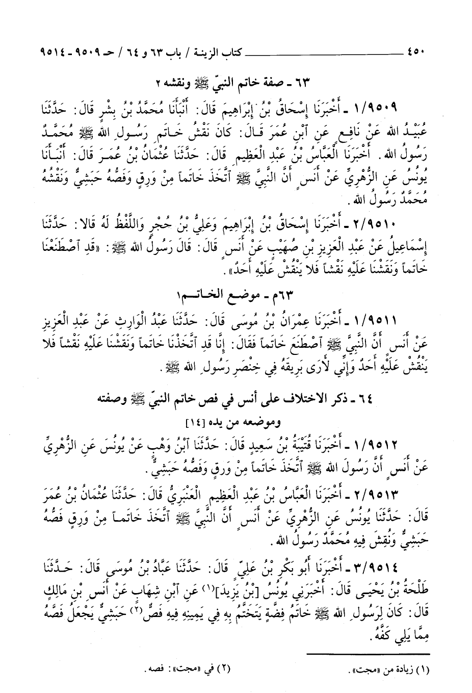9509 - أخبرنا إسحاق بن إبراهيم قال أنبأنا محمد بن بشر قال حدثنا عبيد الله عن نافع عن بن عمر قال كان نقش خاتم رسول الله صلى الله عليه و سلم محمد رسول الله أخبرنا العباس بن عبد العظيم قال حدثنا عثمان بن عمر قال أنبأنا يونس عن الزهري عن أنس : أن النبي صلى الله عليه و سلم اتخذ خاتما من ورق وفصه حبشي ونقشه محمد رسول الله