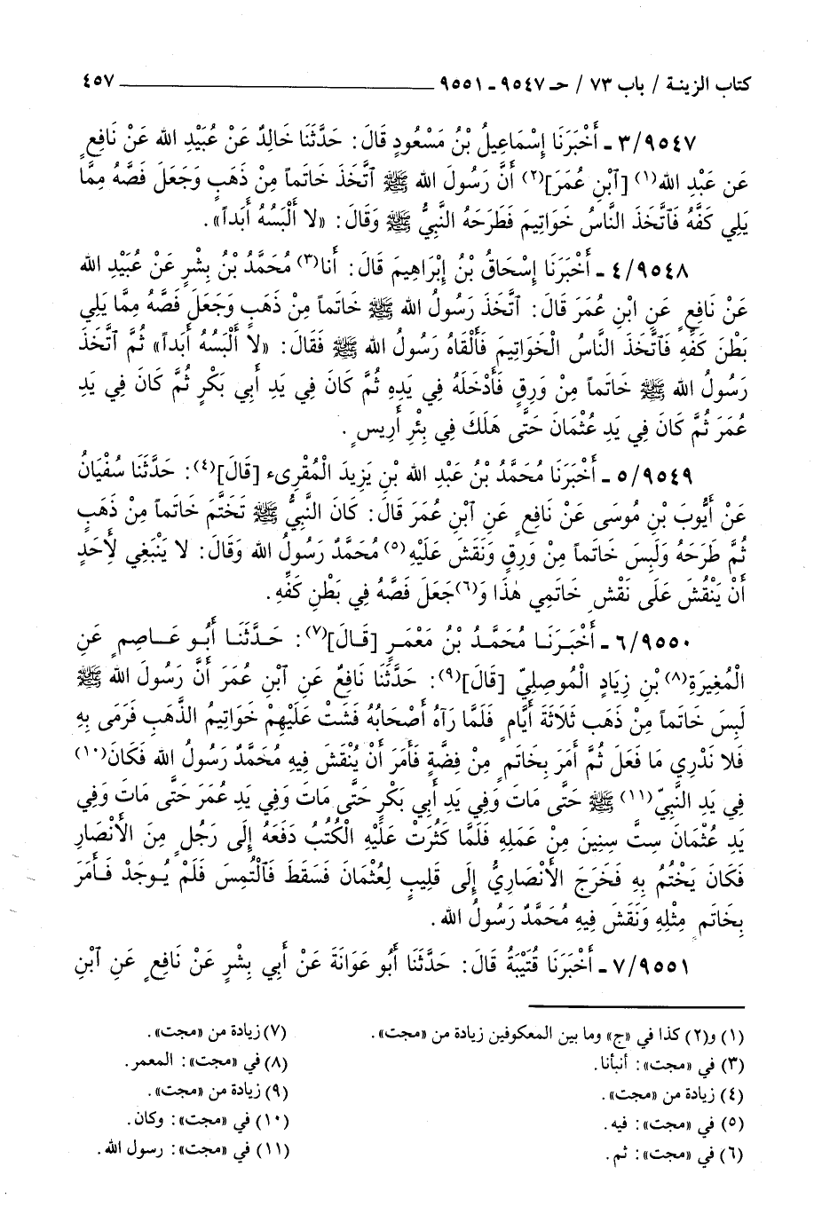 9550 - أخبرنا محمد بن معمر قال حدثنا أبو عاصم عن المغيرة بن زياد الموصلي قال حدثنا نافع عن بن عمر : أن رسول الله صلى الله عليه و سلم لبس خاتما من ذهب ثلاثة أيام فلما رآه أصحابه فشت عليهم خواتيم الذهب فرمى به فلا ندري ما فعل ثم أمر بخاتم من فضة فأمر أن ينقش فيه محمد رسول الله فكان في يد النبي صلى الله عليه و سلم حتى مات وفي يد أبي بكر حتى مات وفي يد عمر حتى مات وفي يد عثمان ست سنين من عمله فلما كثرت عليه الكتب دفعه إلى رجل من الأنصار فكان يختم به فخرج الأنصاري إلى قليب لعثمان فسقط فالتمس فلم يوجد فأمر بخاتم مثله ونقش فيه محمد رسول الله