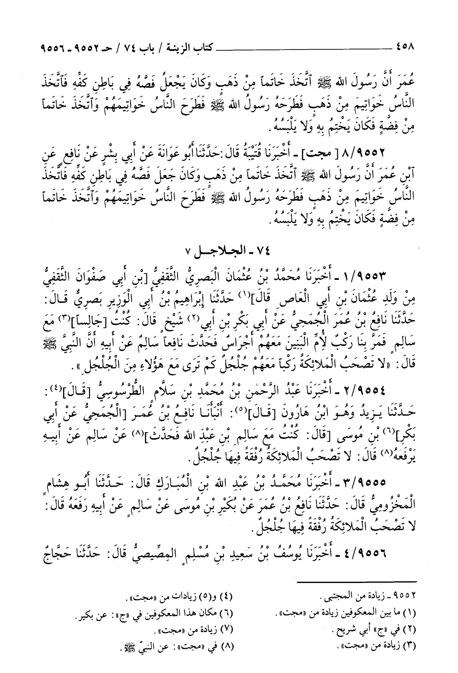9554 - أخبرنا عبد الرحمن بن محمد بن سلام الطرسوسي قال حدثنا يزيد وهو بن هارون قال أنبأنا نافع بن عمر الجمحي عن أبي بكر بن موسى قال كنت مع سالم بن عبد الله فحدث عن سالم عن أبيه يرفعه قال : لا تصحب الملائكة رفقة فيها جلجل