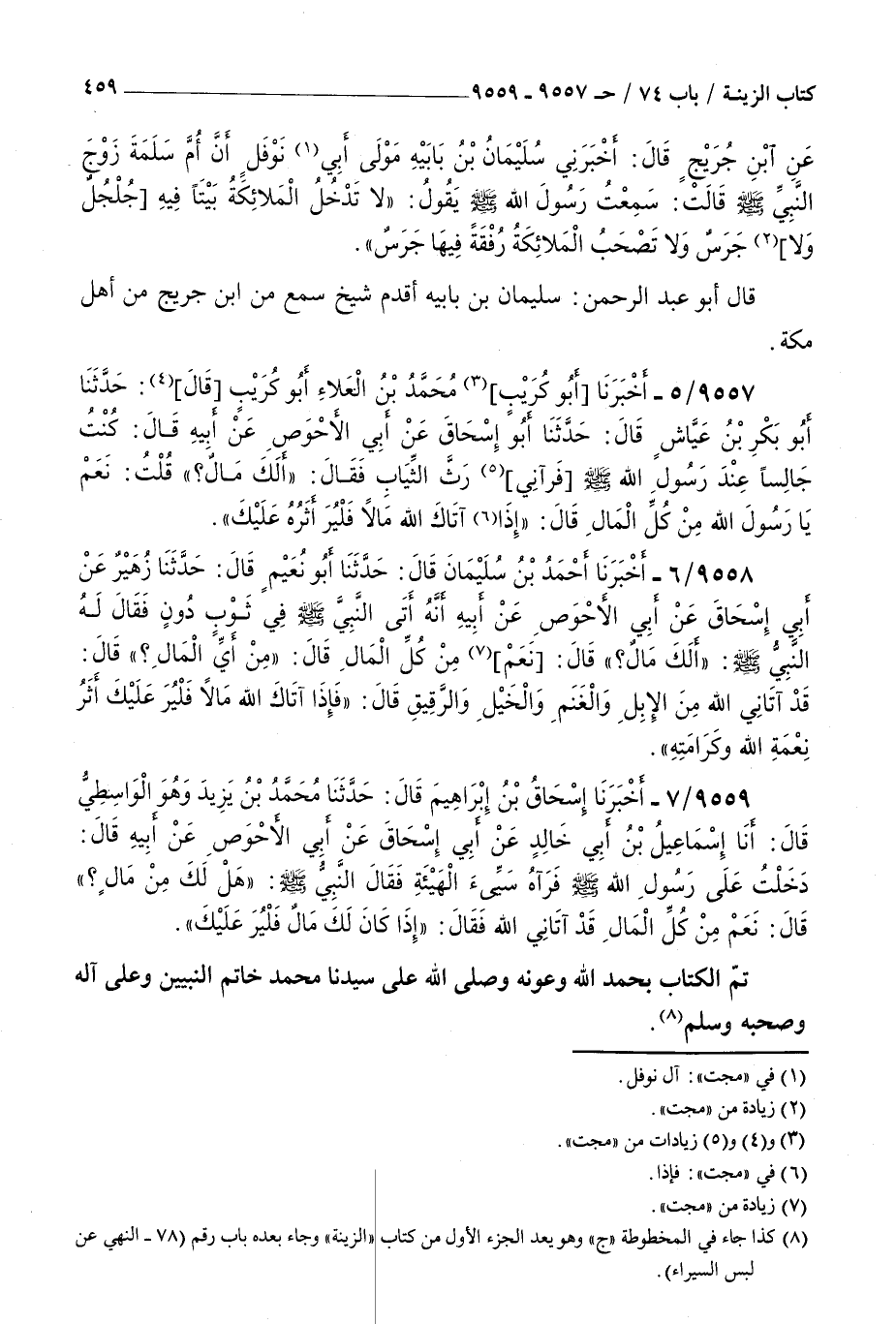 9559 - أخبرنا إسحاق بن إبراهيم قال حدثنا محمد بن يزيد وهو الواسطي قال أنا إسماعيل بن أبي خالد عن أبي إسحاق عن أبي الأحوص عن أبيه قال : دخلت على رسول الله صلى الله عليه و سلم فرآه سيء الهيئة فقال النبي صلى الله عليه و سلم هل لك من مال قال نعم من كل المال قد آتاني الله فقال إذا كان لك مال فلير عليك تم الكتاب بحمد الله وعونه وصلى الله على سيدنا محمد خاتم النبيين وعلى آله وصحبه وسلم