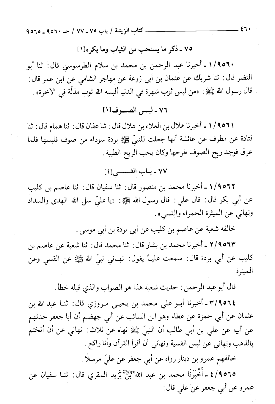 9563 - أخبرنا محمد بن بشار قال ثنا محمد قال ثنا شعبة عن عاصم بن كليب عن أبي بردة قال سمعت عليا يقول : نهاني نبي الله صلى الله عليه و سلم عن القسي وعن الميثرة قال أبو عبد الرحمن حديث شعبة هذا هو الصواب والذي قبله خطأ
