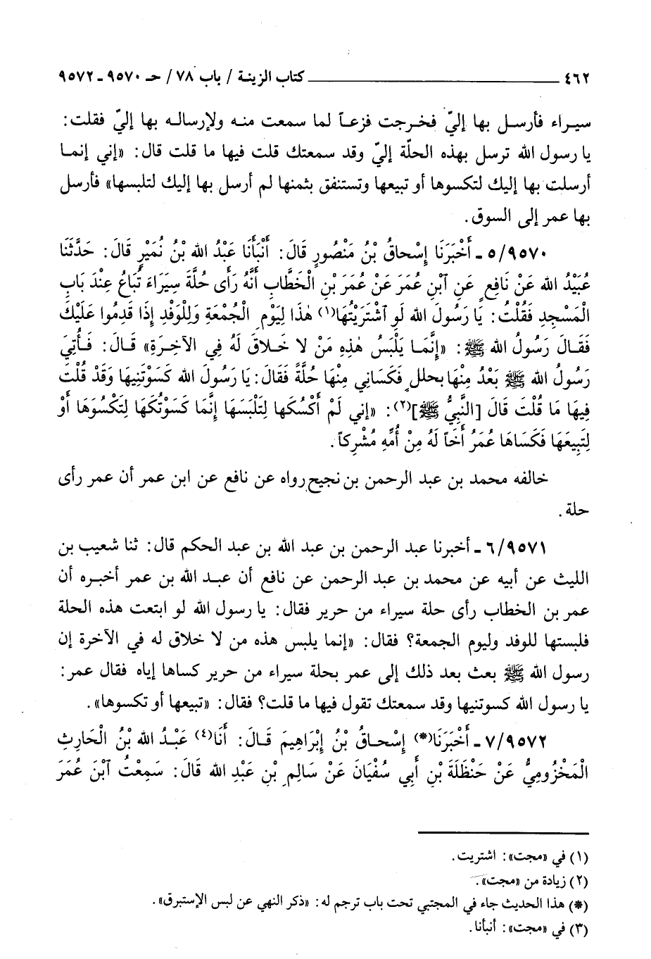 9570 - أخبرنا إسحاق بن منصور قال أنبأنا عبد الله بن نمير قال حدثنا عبيد الله عن نافع عن بن عمر عن عمر بن الخطاب : أنه رأى حلة سيراء تباع عند باب المسجد فقلت يا رسول الله لو اشتريتها هذا ليوم الجمعة وللوفد إذا قدموا عليك فقال رسول الله صلى الله عليه و سلم إنما يلبس هذه من لا خلاق له في الآخرة قال فأتي رسول الله صلى الله عليه و سلم بعد منها بحلل فكساني منها حلة فقال يا رسول الله كسوتنيها وقد قلت فيها ما قلت قال النبي صلى الله عليه و سلم إني لم أكسكها لتلبسها إنما كسوتكها لتكسوها أو لتبيعها فكساها عمر أخا له من أمه مشركا خالفه محمد بن عبد الرحمن بن نجيح رواه عن نافع عن بن عمر أن عمر رأى حلة