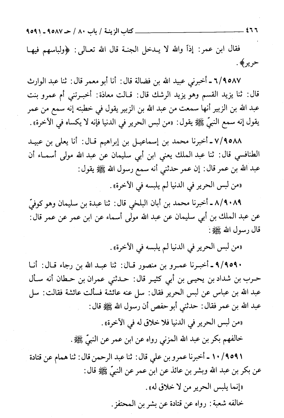 9590 - أخبرنا عمرو بن منصور قال ثنا عبد الله بن رجاء قال أنا حرب بن شداد بن يحيى بن أبي كثير قال حدثني عمران بن حطان : أنه سأل عبد الله بن عباس عن لبس الحرير فقال سل عنه عائشة فسألت عائشة فقالت سل عبد الله بن عمر فقال حدثني أبو حفص أن رسول الله صلى الله عليه و سلم قال من لبس الحرير في الدنيا فلا خلاق له في الآخرة خالفهم بكر بن عبد الله المزني رواه عن بن عمر عن النبي صلى الله عليه و سلم
