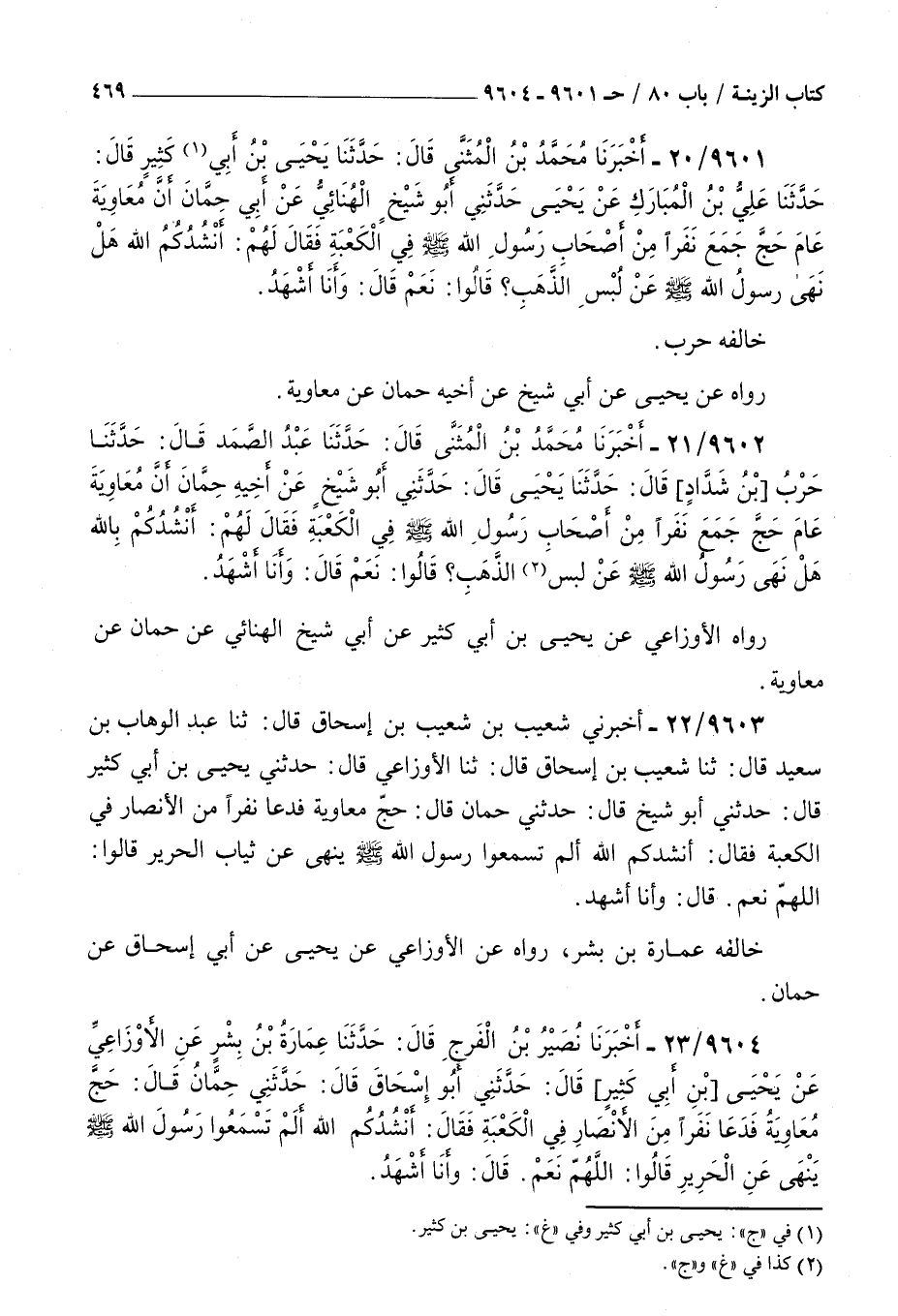 9602 - أخبرنا محمد بن المثنى قال حدثنا عبد الصمد قال حدثنا حرب بن شداد قال حدثنا يحيى قال حدثني أبو شيخ عن أخيه حمان : أن معاوية عام حج جمع نفرا من أصحاب رسول الله صلى الله عليه و سلم في الكعبة فقال لهم أنشدكم بالله هل نهى رسول الله صلى الله عليه و سلم عن لبس الذهب قالوا نعم قال وأنا أشهد رواه الأوزاعي عن يحيى بن أبي كثير عن أبي شيخ الهنائي عن حمان عن معاوية