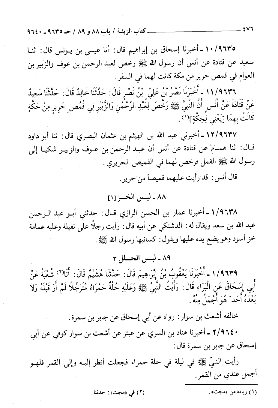 9636 - أخبرنا نصر بن علي بن نصر قال حدثنا خالد قال حدثنا سعيد عن قتادة عن أنس : أن النبي صلى الله عليه و سلم رخص لعبد الرحمن والزبير في قمص حرير من حكة كانت بهما يعني لحكة