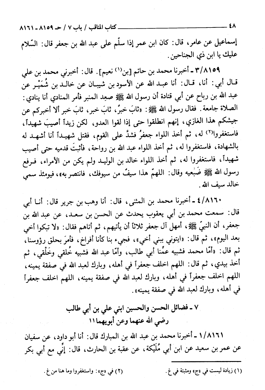 8160 - أخبرنا محمد بن المثنى قال أنا وهب بن جرير قال أنا أبي قال سمعت محمد بن أبي يعقوب يحدث عن الحسن بن سعد عن عبد الله بن جعفر : أن النبي صلى الله عليه و سلم أمهل آل جعفر ثلاثا أن يأتيهم ثم أتاهم فقال لا تبكوا أخي بعد اليوم ثم قال ايتوني ببني أخي فجيء بنا كأنا أفراخ فأمر بحلق رؤوسنا ثم قال أما محمد فشبيه عمنا أبي طالب وأما عبد الله فشبيه خلقي وخلقي ثم أخذ بيدي ثم قال اللهم اخلف جعفرا في أهله وبارك لعبد الله في صفقة يمينه اللهم اخلف جعفرا في أهله وبارك لعبد الله في صفقة يمينه اللهم اخلف جعفرا في أهله وبارك لعبد الله في صفقة يمينه