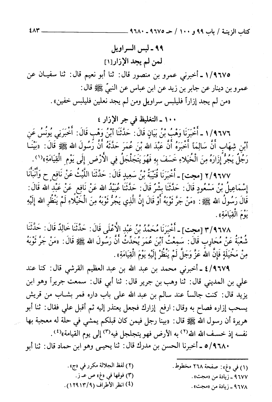 9679 - أخبرني محمد بن عبد الله بن عبد العظيم القرشي قال كنا عند علي بن المديني قال ثنا وهب بن جرير قال ثنا أبي قال سمعت جريرا وهو بن يزيد قال : كنت جالسا عند سالم بن عبد الله على باب داره فمر بشاب من قريش يسحب إزاره فصاح به وقال ارفع إزارك فجعل يعتذر إليه ثم أقبل علي فقال ثنا أبو هريرة أن رسول الله صلى الله عليه و سلم قال بينا رجل فيمن كان قبلكم يمشي في حلة له معجبة بها نفسه إذ خسف الله به الأرض فهو يتجلجل فيه إلى يوم القيامة