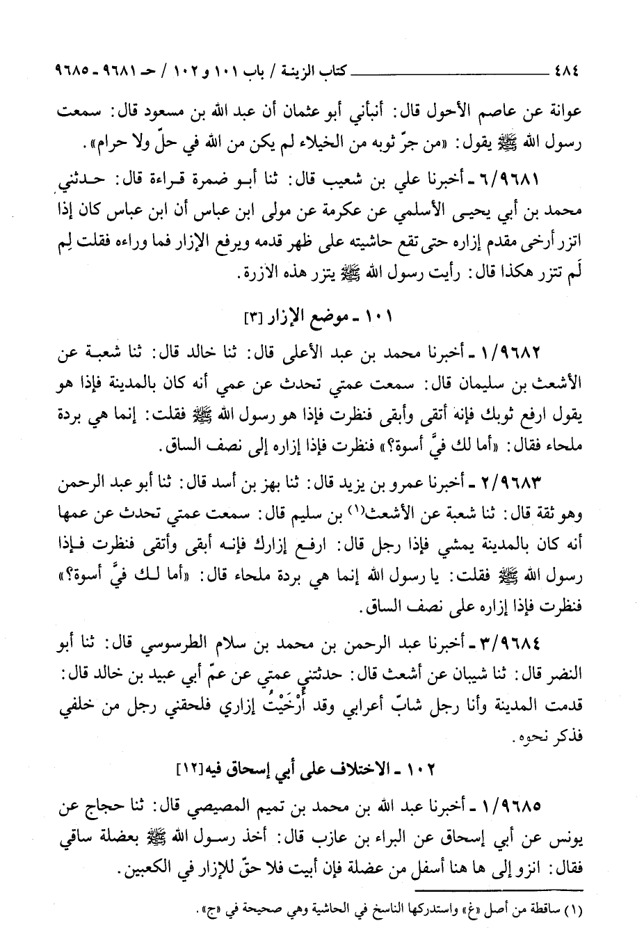 9684 - أخبرنا عبد الرحمن بن محمد بن سلام الطرسوسي قال ثنا أبو النضر قال ثنا شيبان عن أشعث قال حدثتني عمتي عن عم أبي عبيد بن خالد قال : قدمت المدينة وأنا رجل شاب أعرابي وقد أرخيت إزاري فلحقني رجل من خلفي فذكر نحوه