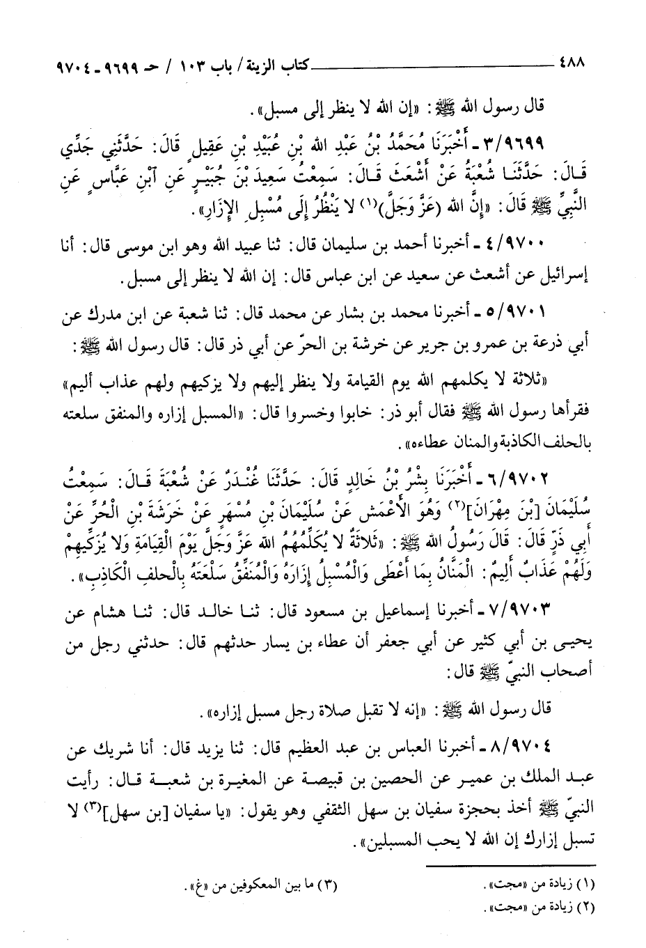 9700 - أخبرنا أحمد بن سليمان قال ثنا عبيد الله وهو بن موسى قال أنا إسرائيل عن أشعث عن سعيد عن بن عباس قال : إن الله لا ينظر إلى مسبل
