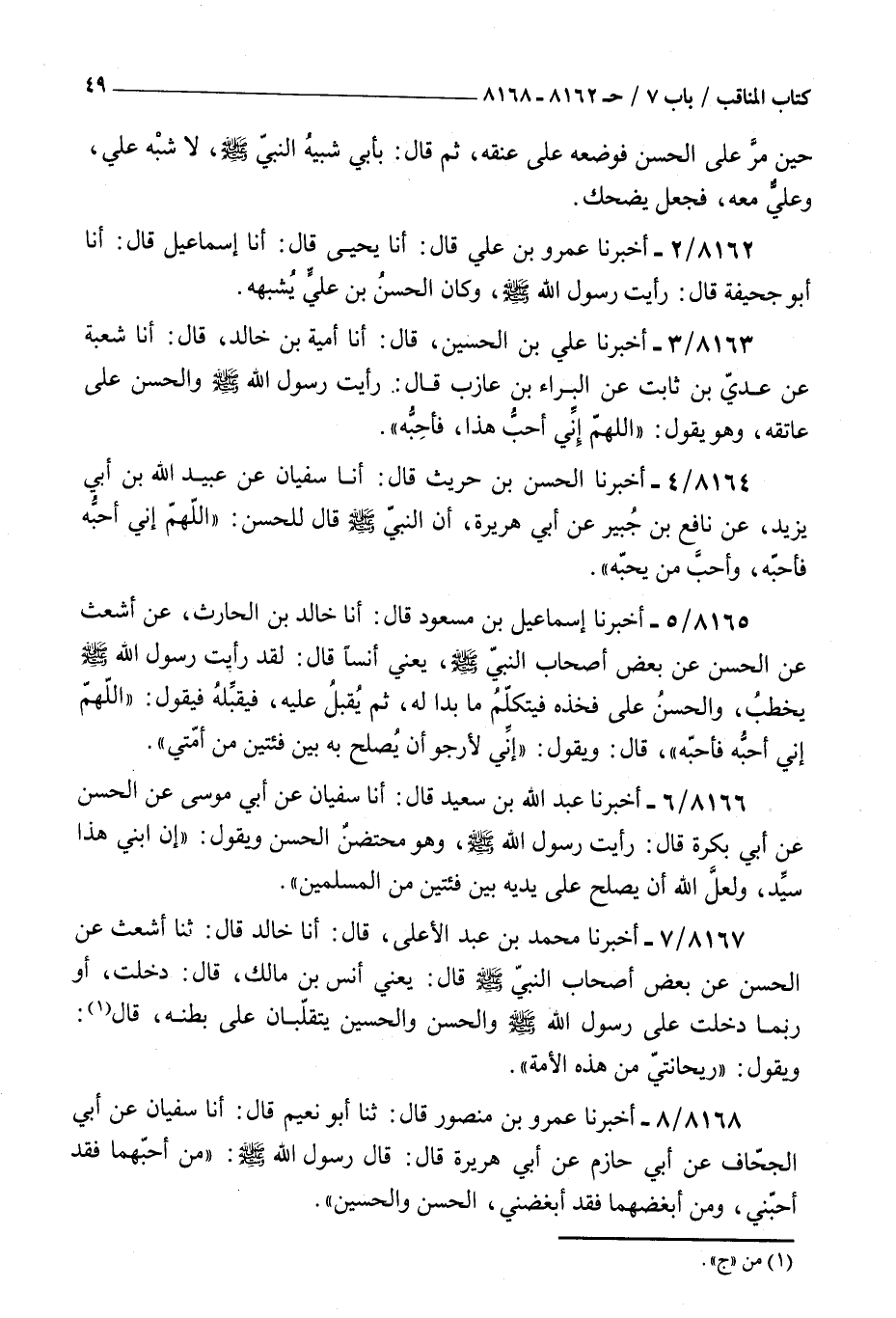 8163 - أخبرنا علي بن الحسين قال أنا أمية بن خالد قال أنا شعبة عن عدي بن ثابت عن البراء بن عازب قال : رأيت رسول الله صلى الله عليه و سلم والحسن على عاتقه وهو يقول اللهم إني أحب هذا فأحبه