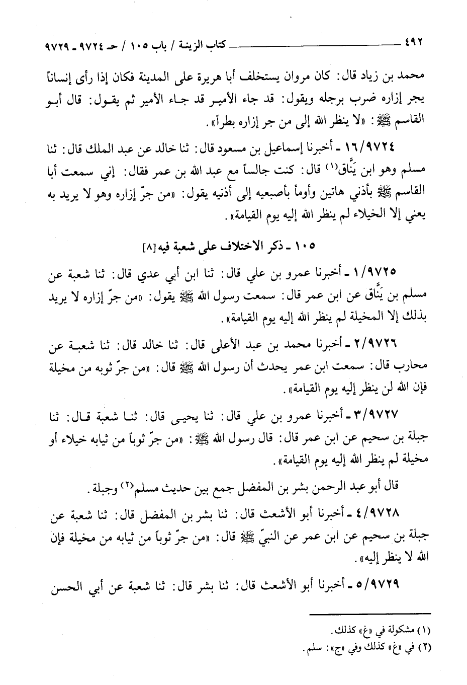 9729 - أخبرنا أبو الأشعث قال ثنا بشر قال ثنا شعبة عن أبي الحسن مسلم بن يناق قال رأيت بن عمر رأى رجلا يجر إزاره فقال سمعت رسول الله صلى الله عليه و سلم يقول : من جر إزاره لا يريد إلا المخيلة لم ينظر الله إليه قال أبو عبد الرحمن غندر بن محمد بن جعفر روى حديث جبلة ومحارب