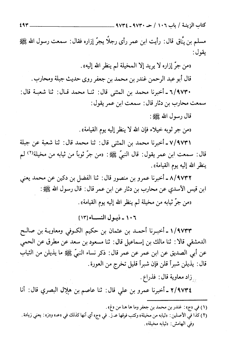 9730 - أخبرنا محمد بن المثنى قال ثنا محمد قال ثنا شعبة قال سمعت محارب بن دثار قال سمعت بن عمر يقول قال رسول الله صلى الله عليه و سلم : من جر ثوبه خيلاء فإن الله لا ينظر إليه يوم القيامة