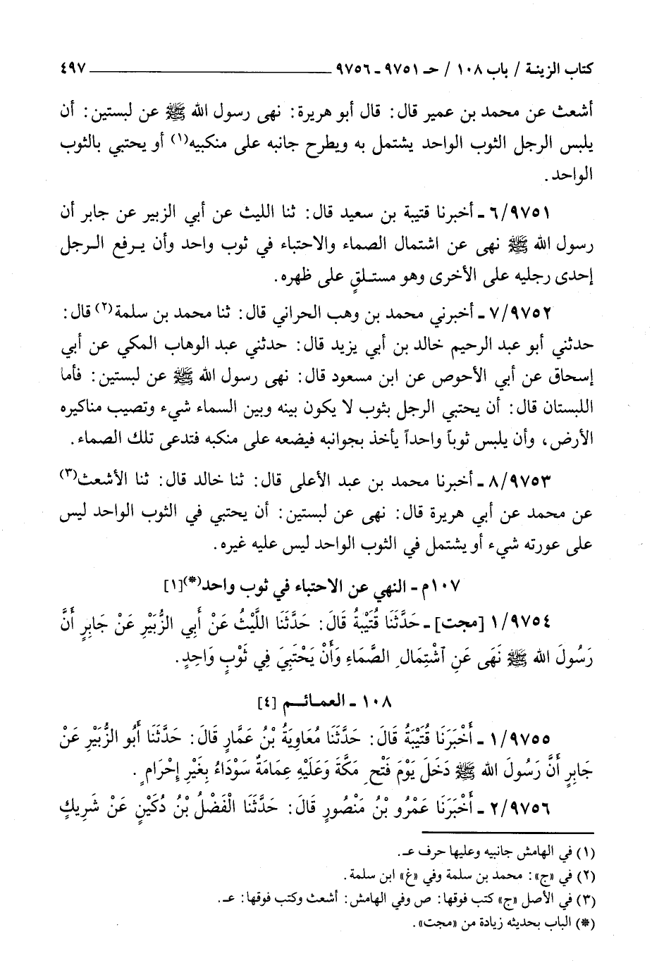 9751 - أخبرنا قتيبة بن سعيد قال ثنا الليث عن أبي الزبير عن جابر : أن رسول الله صلى الله عليه و سلم نهى عن اشتمال الصماء والاحتباء في ثوب واحد وأن يرفع الرجل إحدى رجليه على الأخرى وهو مستلق على ظهره