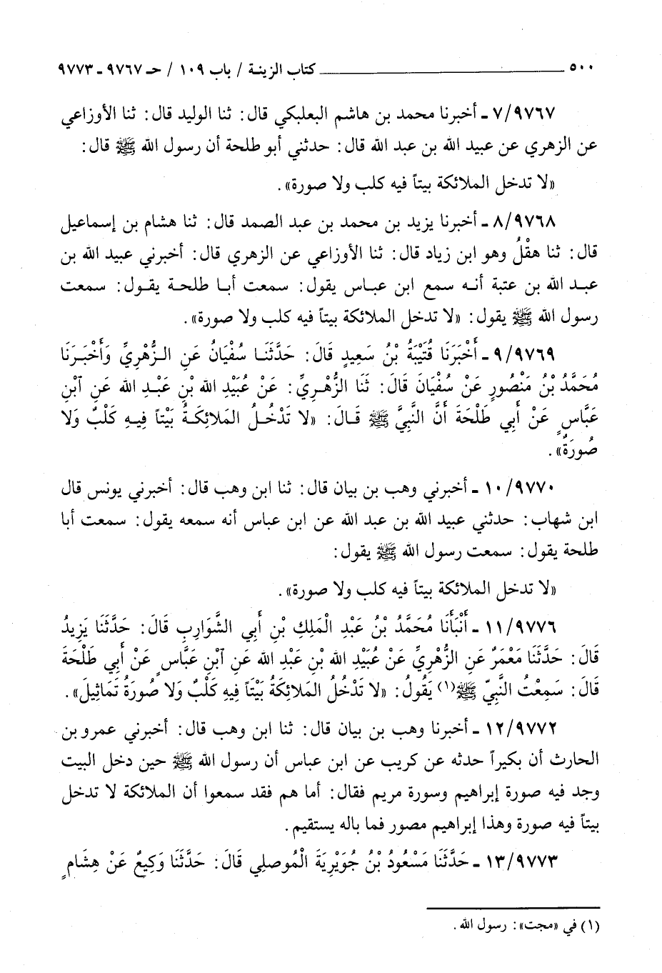 9767 - أخبرنا محمد بن هاشم البعلبكي قال ثنا الوليد قال ثنا الأوزاعي عن الزهري عن عبيد الله بن عبد الله قال حدثني أبو طلحة أن رسول الله صلى الله عليه و سلم قال : لا تدخل الملائكة بيتا فيه كلب ولا صورة