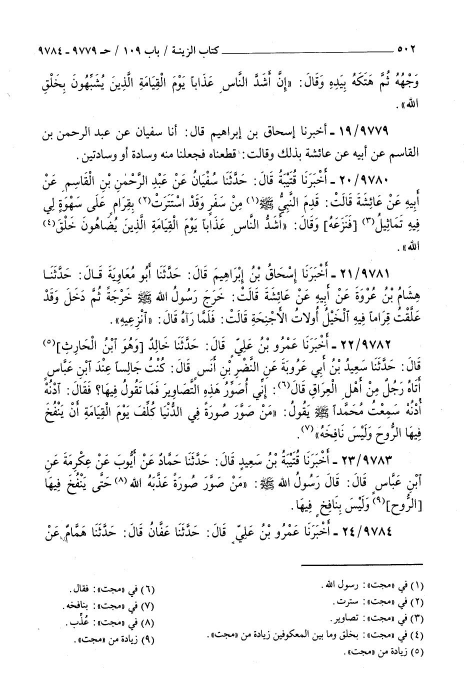 9783 - أخبرنا قتيبة بن سعيد قال حدثنا حماد عن أيوب عن عكرمة عن بن عباس قال قال رسول الله صلى الله عليه و سلم : من صور صورة عذبه الله حتى ينفخ فيها الروح وليس بنافخ فيها